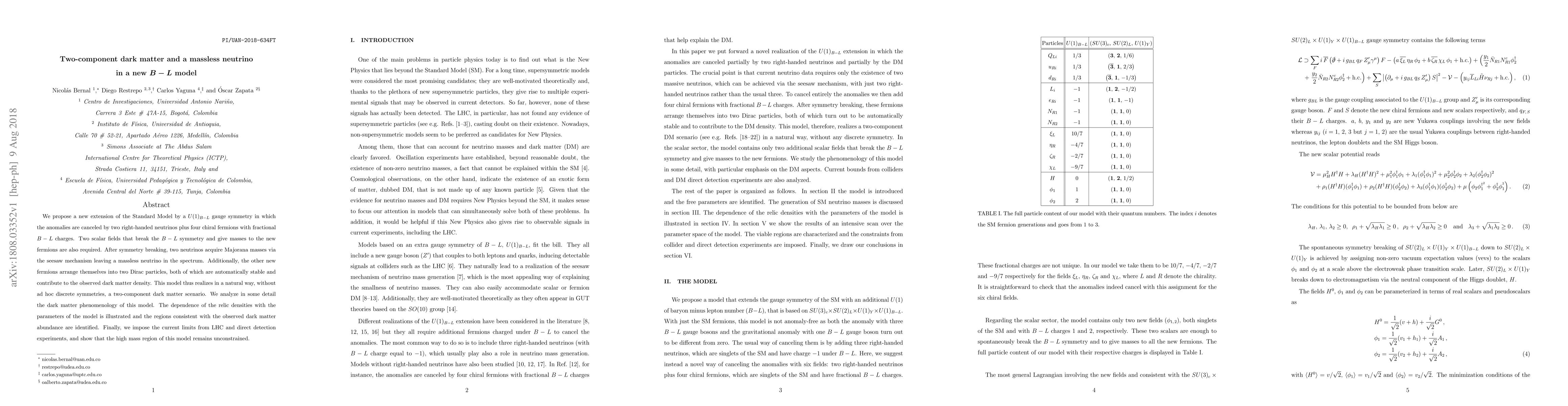 This paper proposes a new $U(1)_{B-L}$ extended Standard Model where two stable Dirac fermions from the model's new fermions naturally constitute dark matter. The model also predicts a massless neutrino, achieved via the seesaw mechanism, and remains unconstrained in high mass regions according to current LHC and direct detection limits.