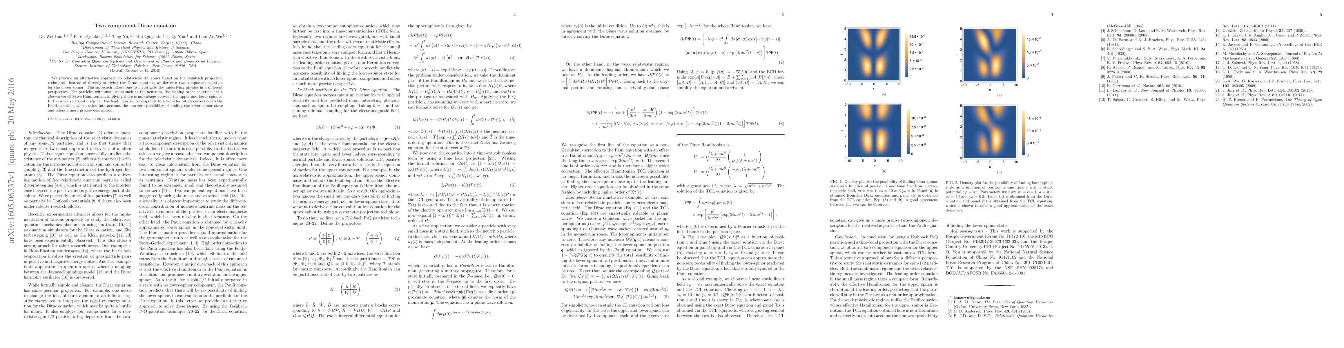 The paper introduces a two-component Dirac equation approach to relativistic dynamics, offering a new perspective on particle physics, particularly for small-mass particles like neutrinos.