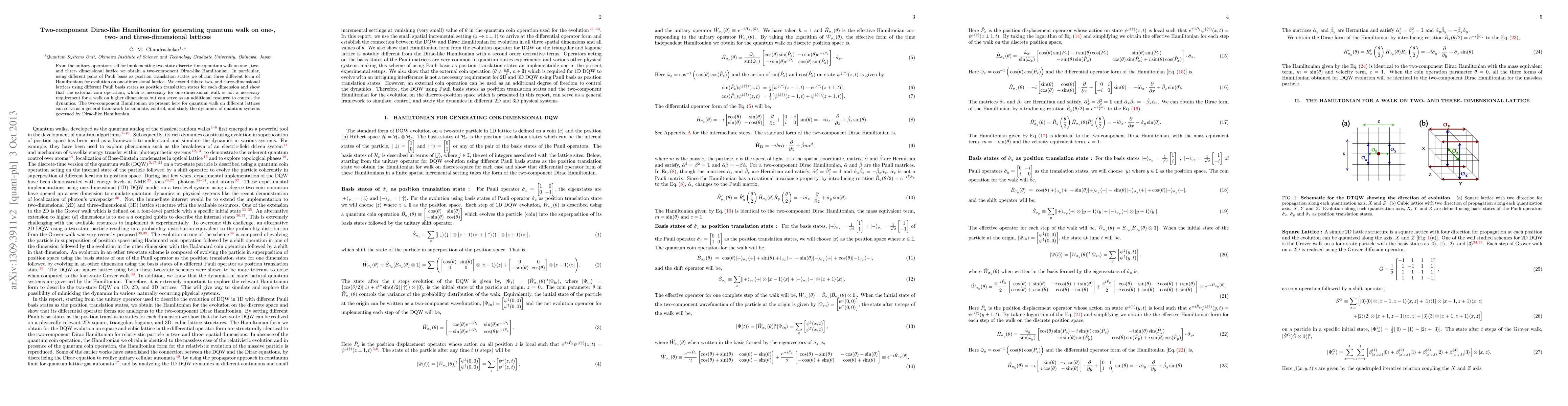 This paper presents a two-component Dirac-like Hamiltonian for simulating quantum walks on one-, two-, and three-dimensional lattices. It shows that while the external coin operation is essential for one-dimensional walks, it is unnecessary for higher dimensions but can be used to control the dynamics.