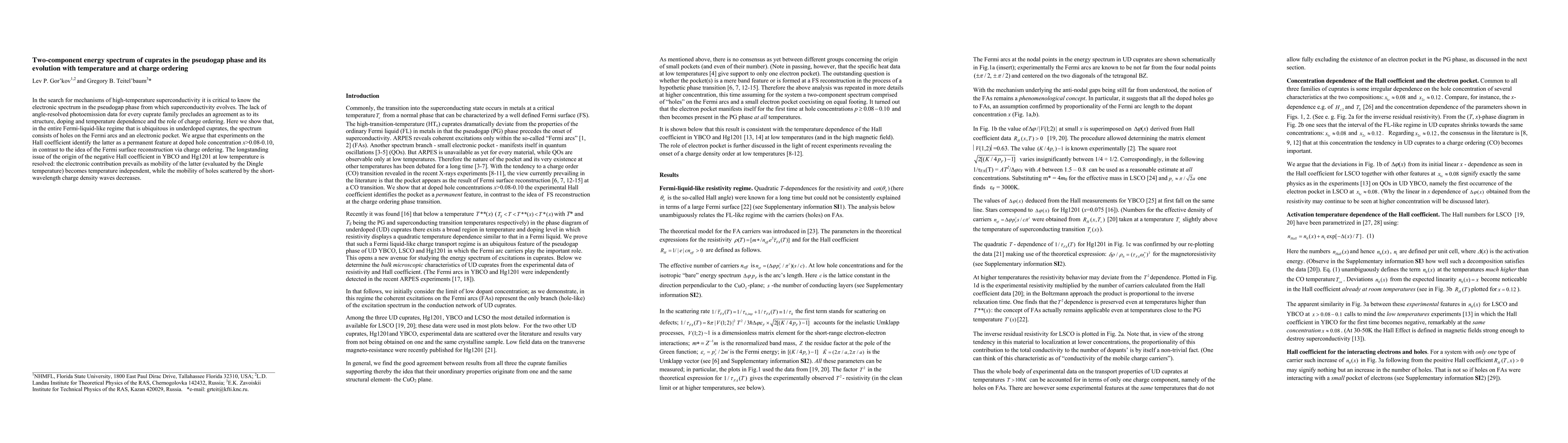 This paper reveals a two-component energy spectrum in underdoped cuprates during the pseudogap phase, consisting of Fermi arcs and an electronic pocket. It argues that the electronic pocket remains stable at doped hole concentrations above 0.08-0.10, refuting Fermi surface reconstruction via charge ordering, and explains the negative Hall coefficient in YBCO and Hg1201 by attributing it to the temperature-independent mobility of the electronic pocket.