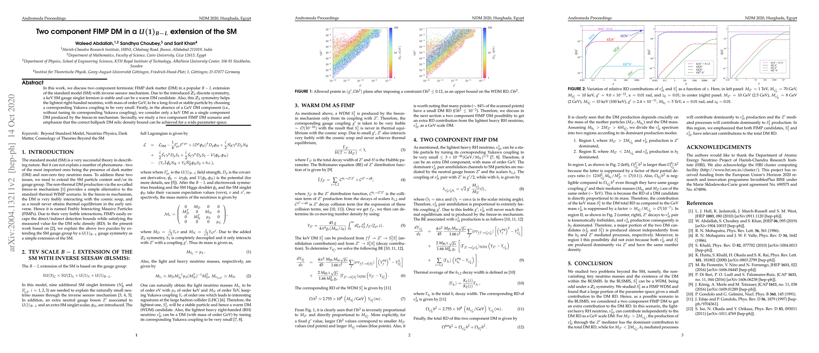 In this work, we discuss two component fermionic FIMP dark matter (DM) in a popular $B-L$ extension of the standard model (SM) with inverse seesaw mechanism. Due to the introduced $\mathbb{Z}_{2}$ discrete symmetry, a keV SM gauge singlet fermion is stable and can be a warm DM candidate. Also, this $\mathbb{Z}_{2}$ symmetry helps the lightest right-handed neutrino, with mass of order GeV, to be a long-lived or stable particle by choosing a corresponding Yukawa coupling to be very small. Firstly, in the absence of a GeV DM component (i.e., without tuning its corresponding Yukawa coupling), we consider only a keV DM as a single component DM produced by the freeze-in mechanism. Secondly, we study a two component FIMP DM scenario and emphasize that the correct ballpark DM relic density bound can be achieved for a wide parameter space.
