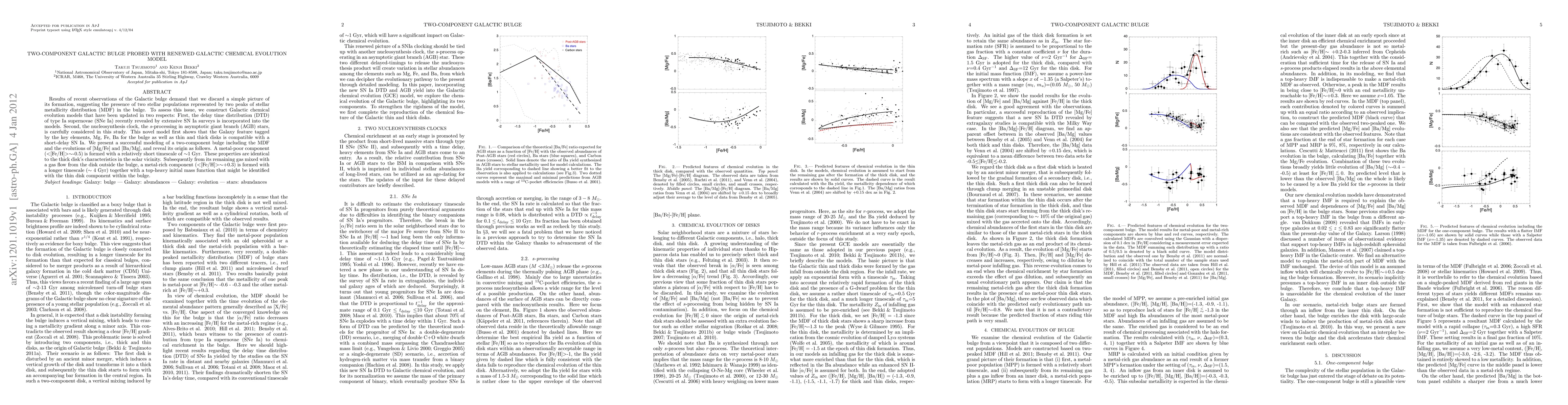 Results of recent observations of the Galactic bulge demand that we discard a simple picture of its formation, suggesting the presence of two stellar populations represented by two peaks of stellar metallicity distribution (MDF) in the bulge. To assess this issue, we construct Galactic chemical evolution models that have been updated in two respects: First, the delay time distribution (DTD) of type Ia supernovae (SNe Ia) recently revealed by extensive SN Ia surveys is incorporated into the models. Second, the nucleosynthesis clock, the s-processing in asymptotic giant branch (AGB) stars, is carefully considered in this study. This novel model first shows that the Galaxy feature tagged by the key elements, Mg, Fe, Ba for the bulge as well as thin and thick disks is compatible with a short-delay SN Ia. We present a successful modeling of a two-component bulge including the MDF and the evolutions of [Mg/Fe] and [Ba/Mg], and reveal its origin as follows. A metal-poor component (<[Fe/H]>~-0.5) is formed with a relatively short timescale of ~1 Gyr. These properties are identical to the thick disk's characteristics in the solar vicinity. Subsequently from its remaining gas mixed with a gas flow from the disk outside the bulge, a metal-rich component (<[Fe/H]>~+0.3) is formed with a longer timescale (~4 Gyr) together with a top-heavy initial mass function that might be identified with the thin disk component within the bulge.
