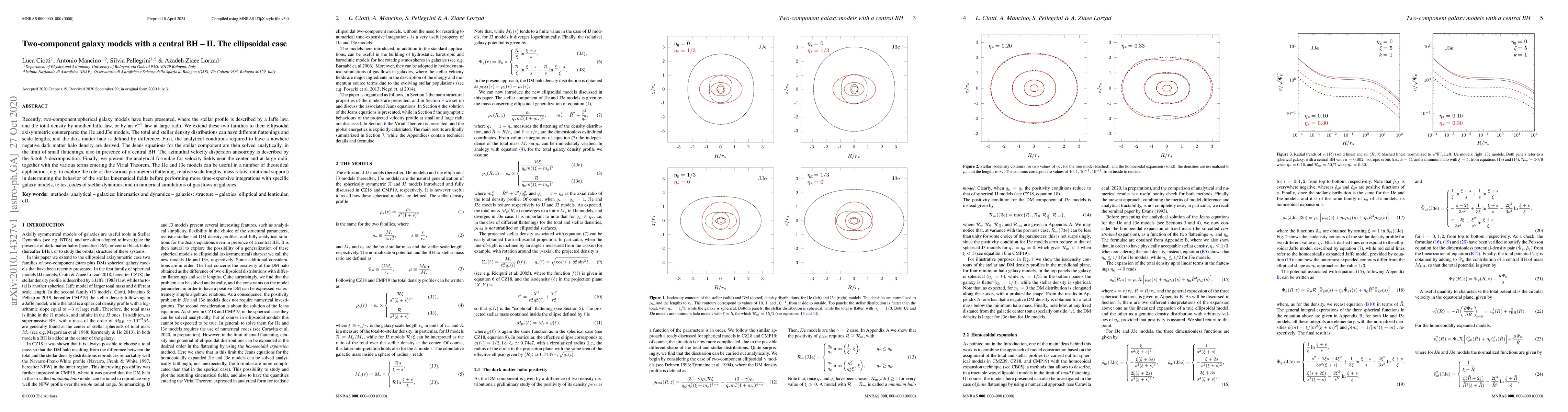 Recently, two-component spherical galaxy models have been presented, where the stellar profile is described by a Jaffe law, and the total density by another Jaffe law, or by an $r^{-3}$ law at large radii. We extend these two families to their ellipsoidal axisymmetric counterparts: the JJe and J3e models. The total and stellar density distributions can have different flattenings and scale lengths, and the dark matter halo is defined by difference. First, the analytical conditions required to have a nowhere negative dark matter halo density are derived. The Jeans equations for the stellar component are then solved analytically, in the limit of small flattenings, also in presence of a central BH. The azimuthal velocity dispersion anisotropy is described by the Satoh $k$-decomposition. Finally, we present the analytical formulae for velocity fields near the center and at large radii, together with the various terms entering the Virial Theorem. The JJe and J3e models can be useful in a number of theoretical applications, e.g. to explore the role of the various parameters (flattening, relative scale lengths, mass ratios, rotational support) in determining the behavior of the stellar kinematical fields before performing more time-expensive integrations with specific galaxy models, to test codes of stellar dynamics, and in numerical simulations of gas flows in galaxies.