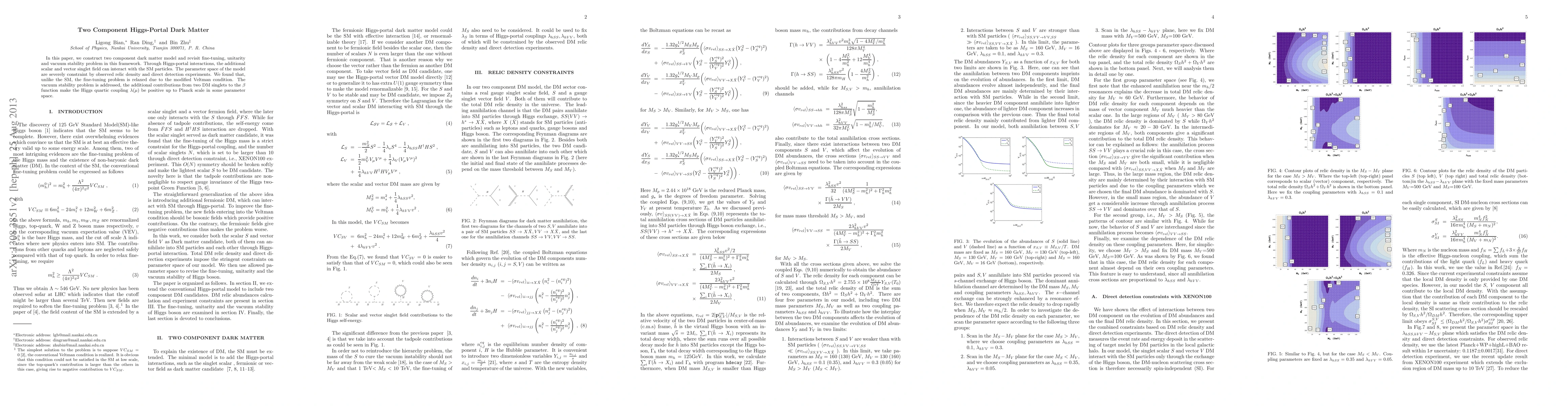 This paper constructs a two-component dark matter model with Higgs-portal interactions involving an additional scalar and vector singlet field. The model addresses fine-tuning, unitarity, and vacuum stability issues, finding that the fine-tuning problem is alleviated and vacuum stability is maintained due to modified contributions from the dark matter components.