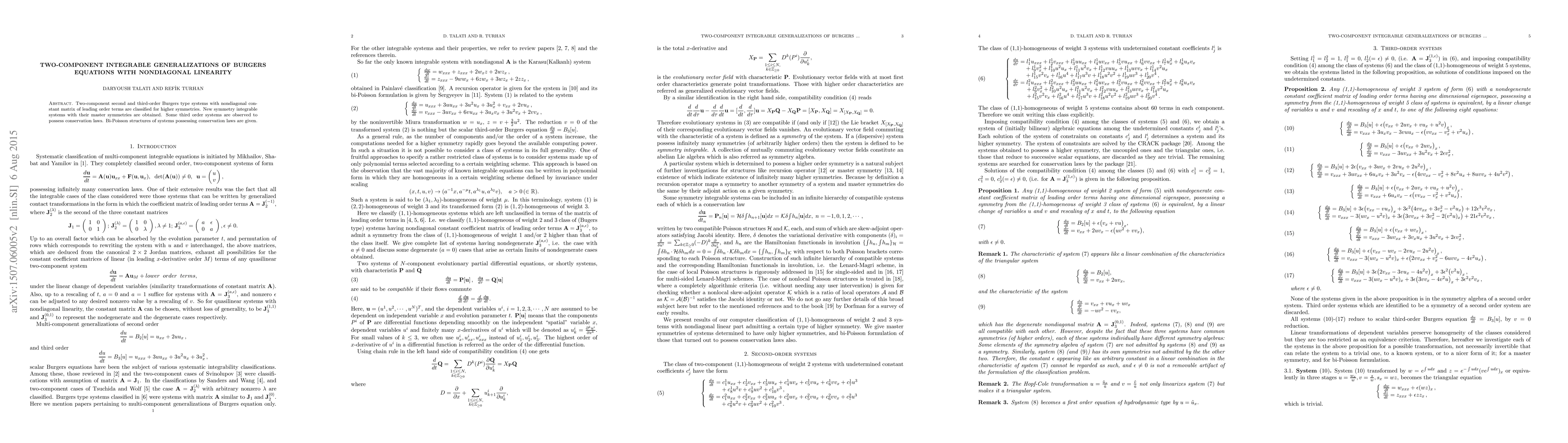 Researchers classified two-component Burgers type systems with nondiagonal linearity and discovered new symmetry integrable systems with conservation laws.