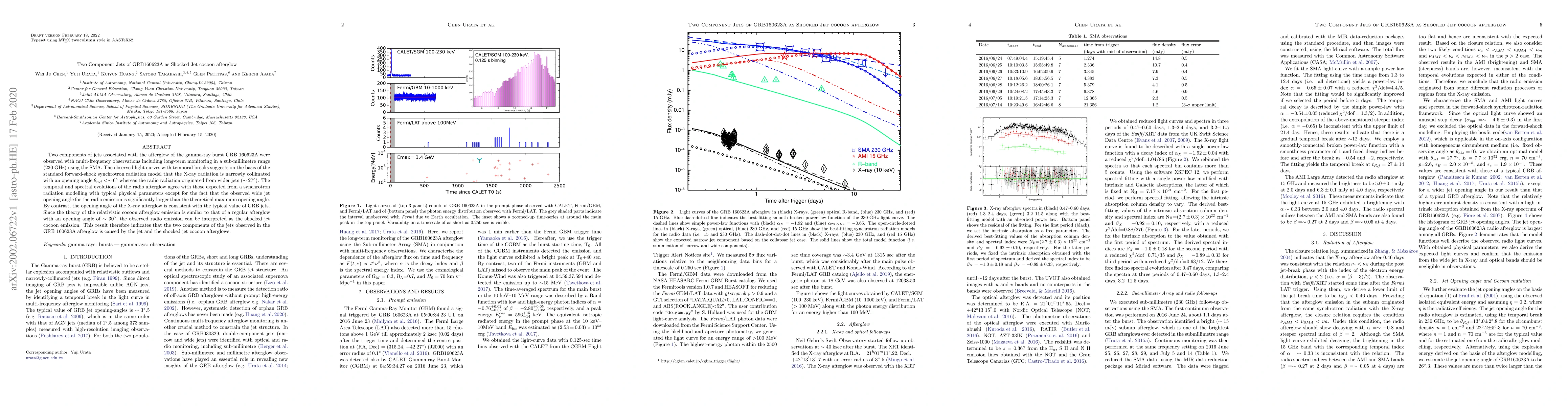 Two components of jets associated with the afterglow of the gamma-ray burst GRB 160623A were observed with multi-frequency observations including long-term monitoring in a sub-millimetre range (230 GHz) using the SMA. The observed light curves with temporal breaks suggests on the basis of the standard forward-shock synchrotron radiation model that the X-ray radiation is narrowly collimated with an opening angle $\theta_{n,j}<\sim6^{\circ}$ whereas the radio radiation originated from wider jets ($\sim27^{\circ}$). The temporal and spectral evolutions of the radio afterglow agree with those expected from a synchrotron radiation modelling with typical physical parameters except for the fact that the observed wide jet opening angle for the radio emission is significantly larger than the theoretical maximum opening angle. By contrast, the opening angle of the X-ray afterglow is consistent with the typical value of GRB jets. Since the theory of the relativistic cocoon afterglow emission is similar to that of a regular afterglow with an opening angle of $\sim30^{\circ}$, the observed radio emission can be interpreted as the shocked jet cocoon emission. This result therefore indicates that the two components of the jets observed in the GRB 160623A afterglow is caused by the jet and the shocked jet cocoon afterglows.
