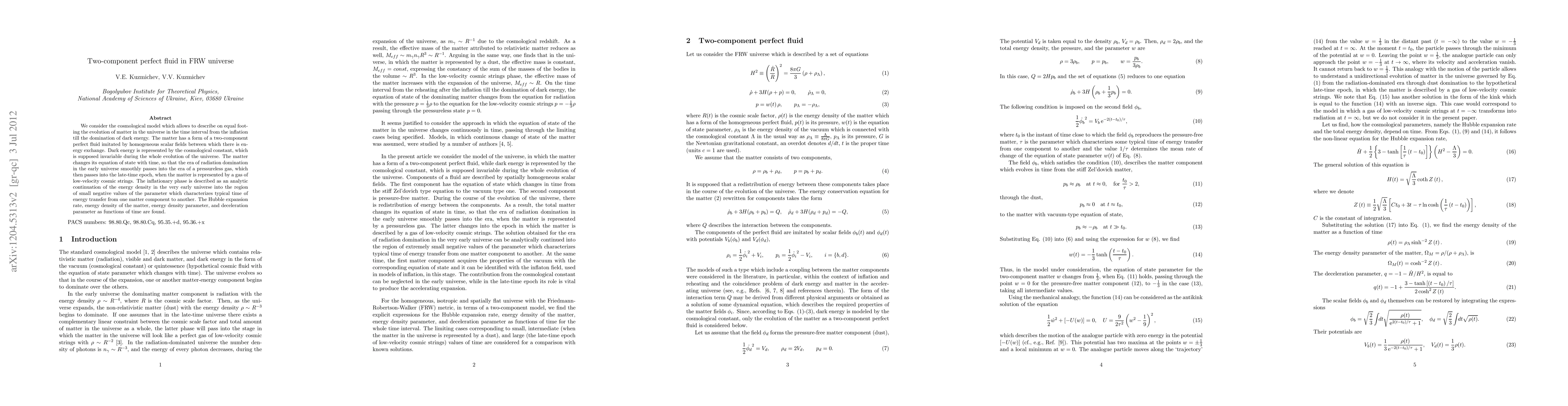 We consider the cosmological model which allows to describe on equal footing the evolution of matter in the universe on the time interval from the inflation till the domination of dark energy. The matter is considered as a two-component perfect fluid imitated by homogeneous scalar fields between which there is energy exchange. Dark energy is represented by the cosmological constant, which is supposed invariable during the whole evolution of the universe. The matter changes its equation of state with time, so that the era of radiation domination in the early universe smoothly passes into the era of a pressureless gas, which then passes into the late-time epoch, when the matter is represented by a gas of low-velocity cosmic strings. The inflationary phase is described as an analytic continuation of the energy density in the very early universe into the region of small negative values of the parameter which characterizes typical time of energy transfer from one matter component to another. The Hubble expansion rate, energy density of the matter, energy density parameter, and deceleration parameter as functions of time are found.