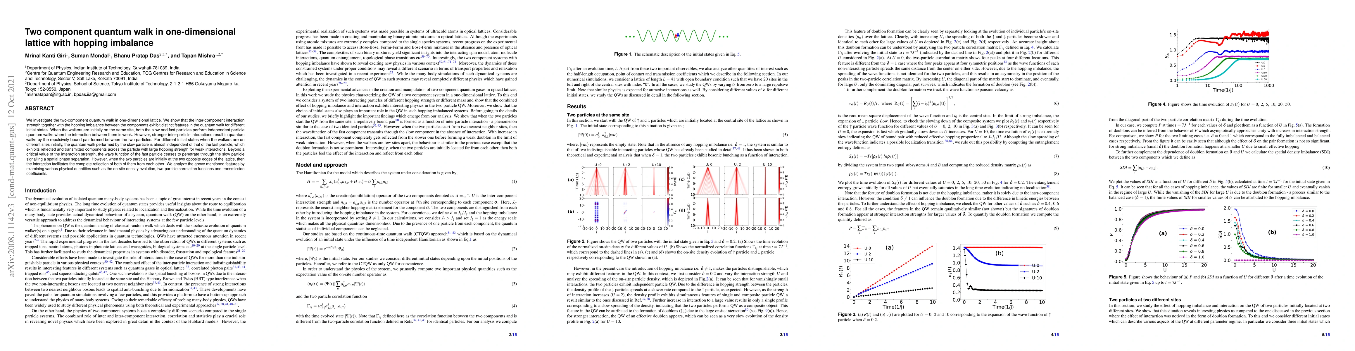 This paper explores the dynamics of two-component quantum walks in a one-dimensional lattice with hopping imbalance, revealing distinct behaviors influenced by the inter-component interaction strength and initial states. The study finds that weak interactions lead to independent walks, while stronger interactions can cause the formation of a repulsively bound pair, and spatial phase separation emerges beyond a critical interaction threshold.