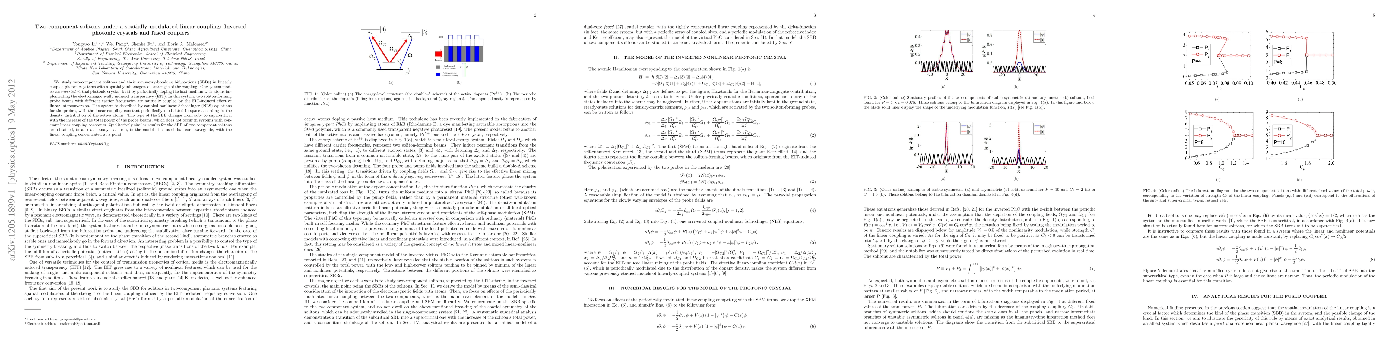 We study two-component solitons and their symmetry-breaking bifurcations (SBBs) in linearly coupled photonic systems with a spatially inhomogeneous strength of the coupling. One system models an inverted virtual photonic crystal, built by periodically doping the host medium with atoms implementing the electromagnetically induced transparency (EIT). In this system, two soliton-forming probe beams with different carrier frequencies are mutually coupled by the EIT-induced effective linear interconversion. The system is described by coupled nonlinear Schr\"{o}dinger (NLS) equations for the probes, with the linear-coupling constant periodically modulated in space according to the density distribution of the active atoms. The type of the SBB changes from sub- to supercritical with the increase of the total power of the probe beams, which does not occur in systems with constant linear-coupling constants. Qualitatively similar results for the SBB of two-component solitons are obtained, in an exact analytical form, in the model of a fused dual-core waveguide, with the linear coupling concentrated at a point.
