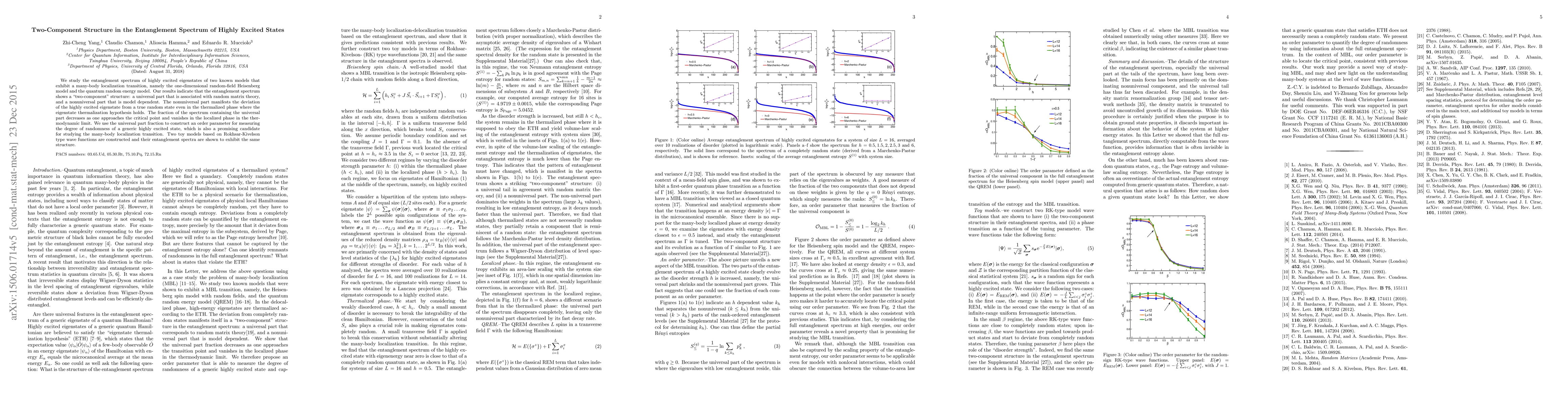This paper investigates the entanglement spectrum of highly excited states in two models showing many-body localization, revealing a "two-component" structure: a universal part linked to random matrix theory and a model-specific nonuniversal part. The universal part fraction diminishes near the critical point, serving as an order parameter for randomness in highly excited states.