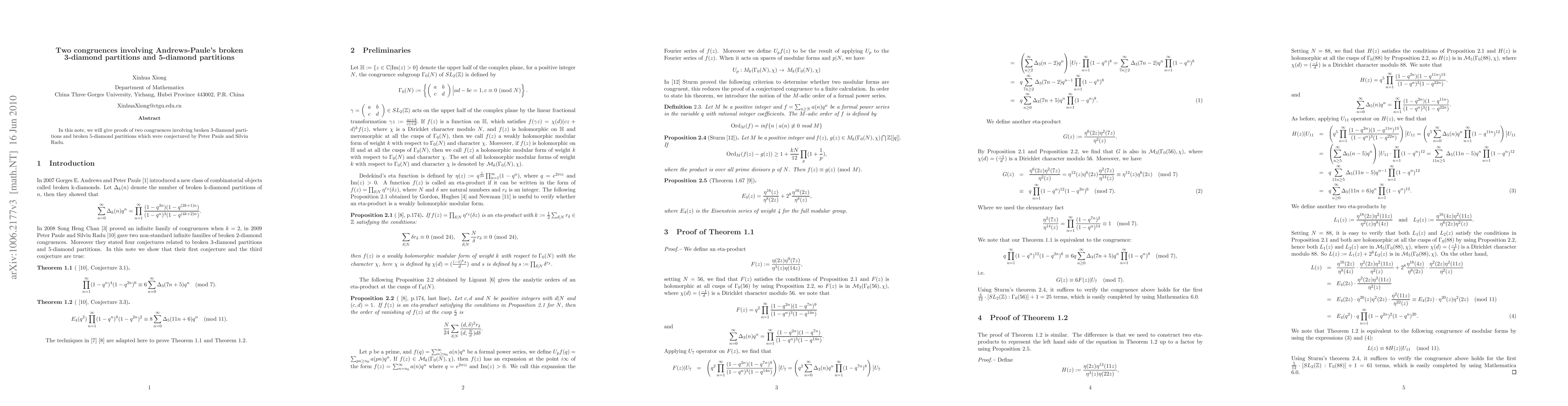 In this note, we will give proofs of two congruences involving broken 3-diamond partitions and broken 5-diamond partitions which were conjectured by Peter Paule and Silviu Radu.