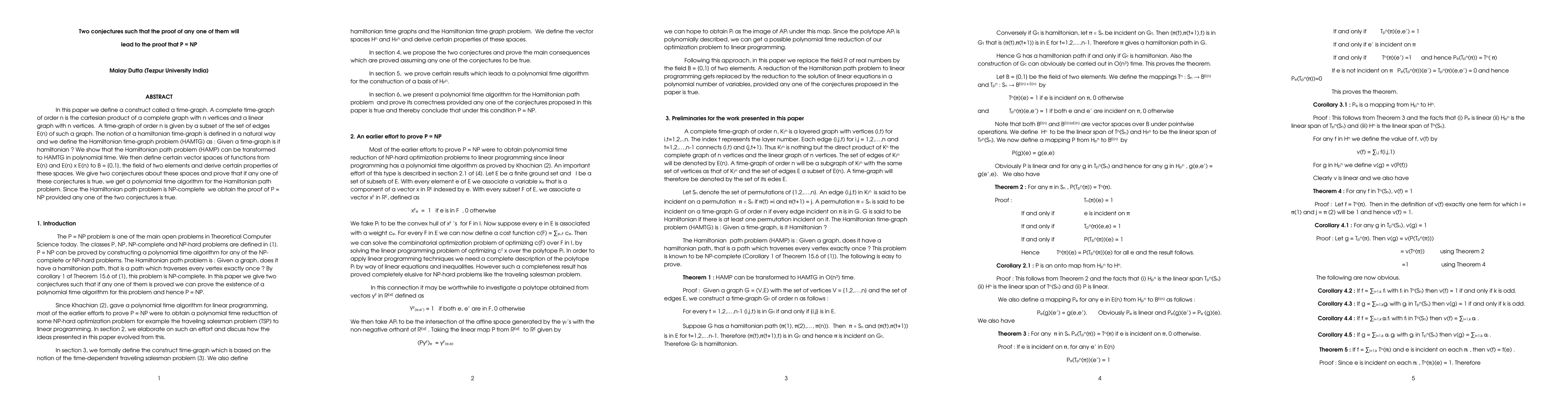 In this paper we define a construct called a time-graph. A complete time-graph of order n is the cartesian product of a complete graph with n vertices and a linear graph with n vertices. A time-graph of order n is given by a subset of the set of edges E(n) of such a graph. The notion of a hamiltonian time-graph is defined in a natural way and we define the Hamiltonian time-graph problem (HAMTG) as : Given a time-graph is it hamiltonian ? We show that the Hamiltonian path problem (HAMP) can be transformed to HAMTG in polynomial time. We then define certain vector spaces of functions from E(n) and E(n)xE(n) to B = {0,1}, the field of two elements and derive certain properties of these spaces. We give two conjectures about these spaces and prove that if any one of these conjectures is true, we get a polynomial time algorithm for the Hamiltonian path problem. Since the Hamiltonian path problem is NP-complete we obtain the proof of P = NP provided any one of the two conjectures is true.
