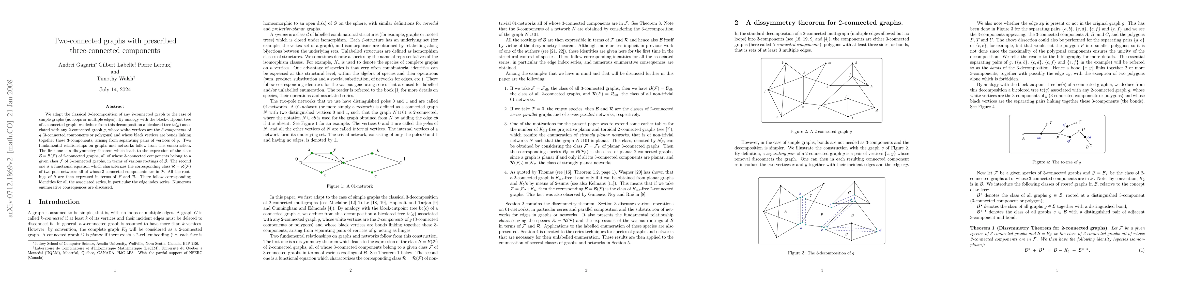 This paper adapts the 3-decomposition of 2-connected graphs into simple graphs, leading to a bicolored tree tc(g) that represents 3-connected components and bonds. It establishes a dissymmetry theorem and a functional equation characterizing classes of 2-connected graphs and two-pole networks based on their 3-connected components, with significant enumerative implications.