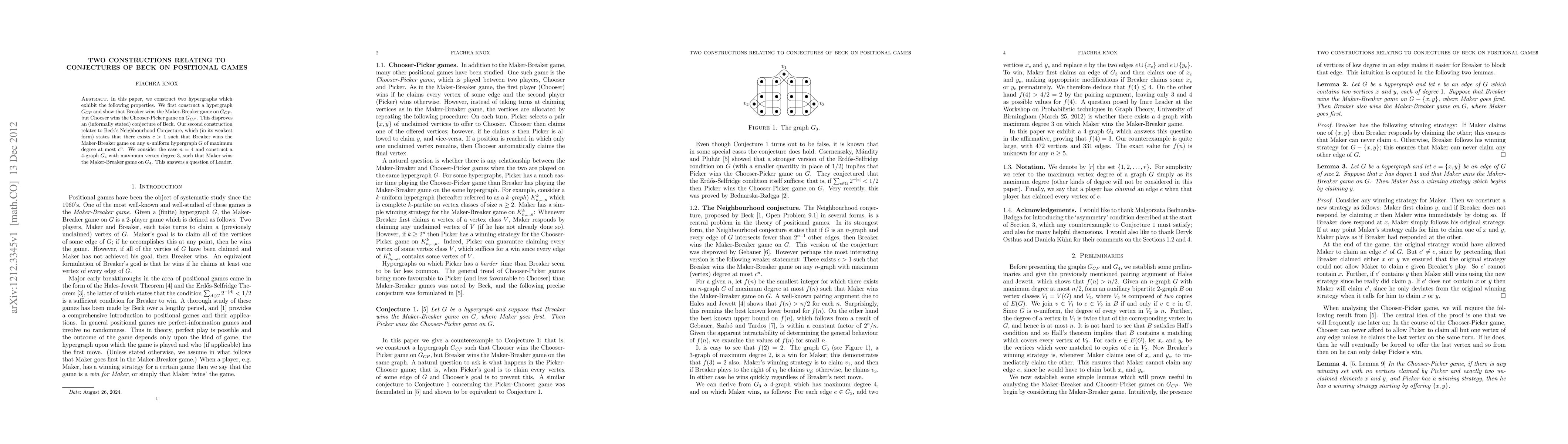 In this paper, we construct two hypergraphs which exhibit the following properties. We first construct a hypergraph $G_{CP}$ and show that Breaker wins the Maker-Breaker game on $G_{CP}$, but Chooser wins the Chooser-Picker game on $G_{CP}$. This disproves an (informally stated) conjecture of Beck. Our second construction relates to Beck's Neighbourhood Conjecture, which (in its weakest form) states that there exists $c > 1$ such that Breaker wins the Maker-Breaker game on any $n$-uniform hypergraph $G$ of maximum degree at most $c^n$. We consider the case n=4 and construct a 4-graph $G_4$ with maximum vertex degree 3, such that Maker wins the Maker-Breaker game on $G_4$. This answers a question of Leader.