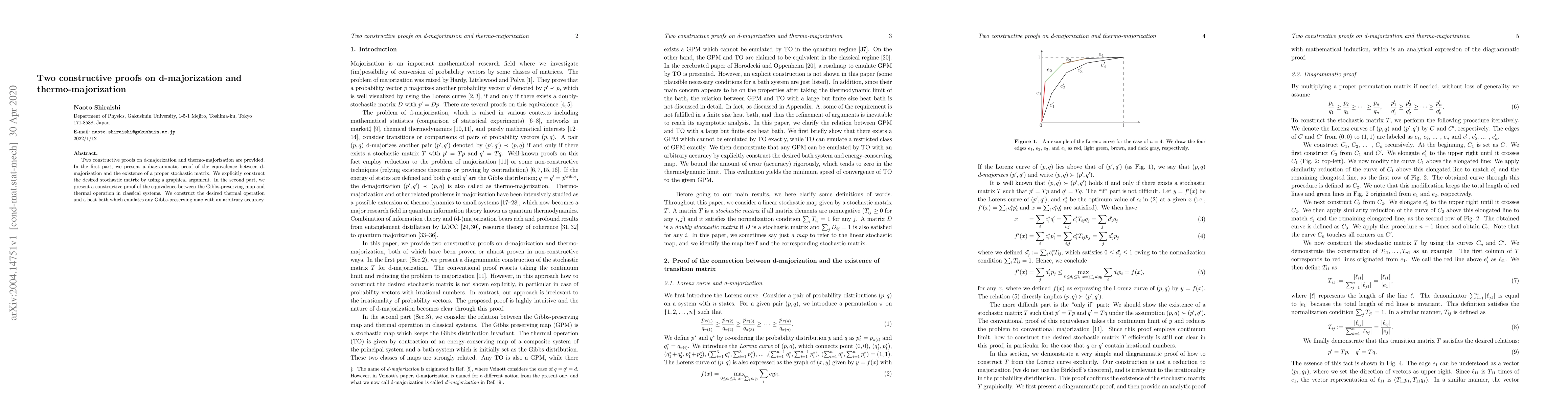 This paper provides two constructive proofs: one demonstrates the equivalence between d-majorization and the existence of a proper stochastic matrix through a diagrammatic approach, and the other constructs a thermal operation and a heat bath to emulate any Gibbs-preserving map in classical systems.
