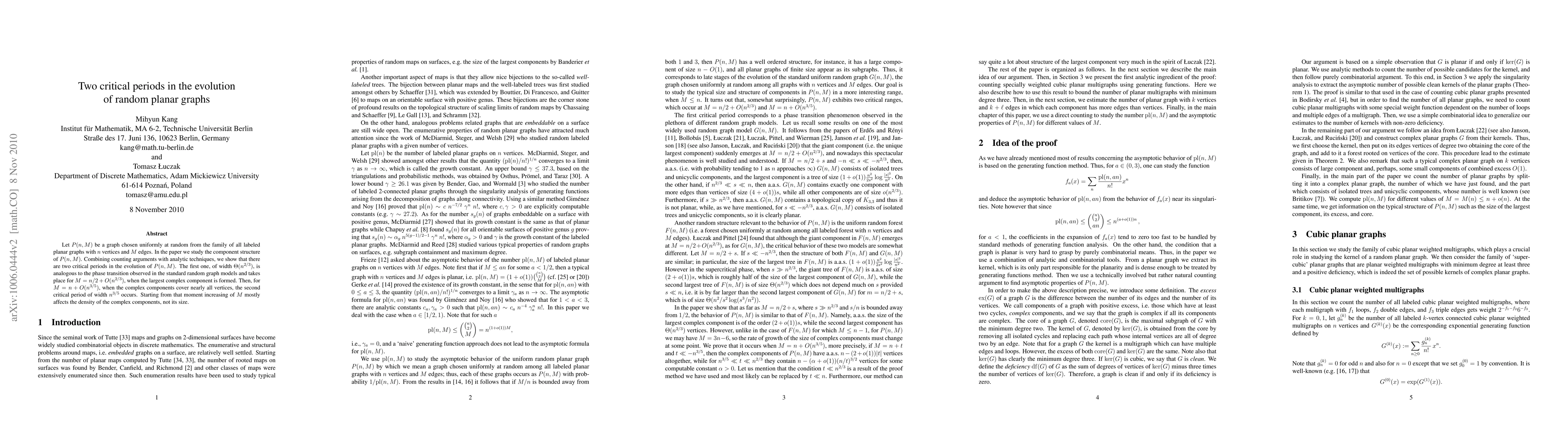 Let $P(n,M)$ be a graph chosen uniformly at random from the family of all labeled planar graphs with $n$ vertices and $M$ edges. In the paper we study the component structure of $P(n,M)$. Combining counting arguments with analytic techniques, we show that there are two critical periods in the evolution of $P(n,M)$. The first one, of width $\Theta(n^{2/3})$, is analogous to the phase transition observed in the standard random graph models and takes place for $M=n/2+O(n^{2/3})$, when the largest complex component is formed. Then, for $M=n+O(n^{3/5})$, when the complex components cover nearly all vertices, the second critical period of width $n^{3/5}$ occurs. Starting from that moment increasing of $M$ mostly affects the density of the complex components, not its size.