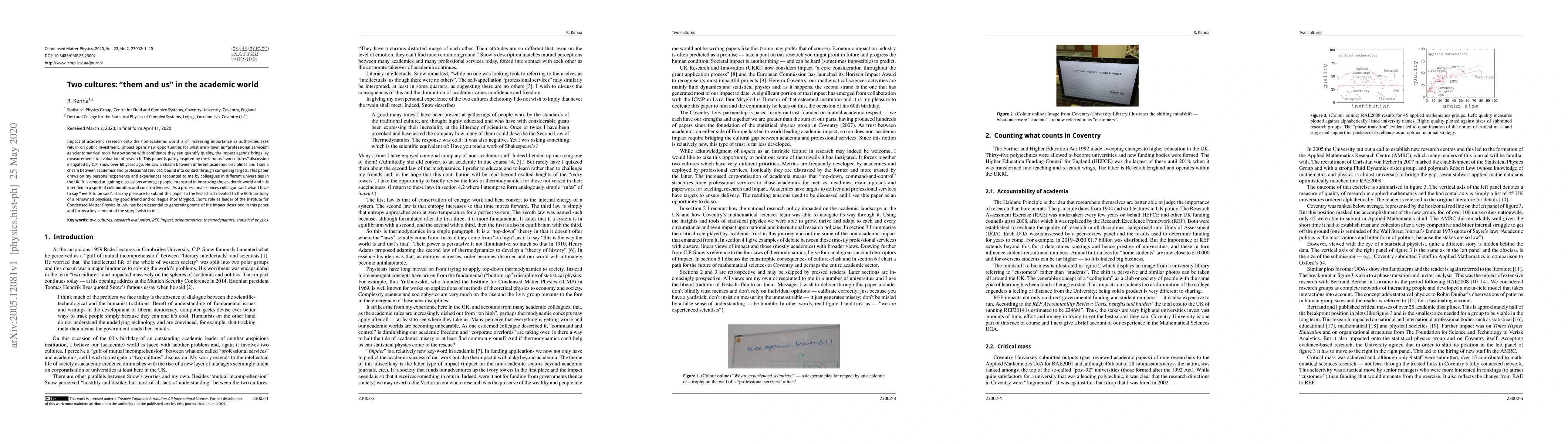 Impact of academic research onto the non-academic world is of increasing importance as authorities seek return on public investment. Impact opens new opportunities for what are known as "professional services": as scientometrical tools bestow some with confidence they can quantify quality, the impact agenda brings lay measurements to evaluation of research. This paper is partly inspired by the famous "two cultures" discussion instigated by C.P. Snow over 60 years ago. He saw a chasm between different academic disciplines and I see a chasm between academics and professional services, bound into contact through competing targets. This paper draws on my personal experience and experiences recounted to me by colleagues in different universities in the UK. It is aimed at igniting discussions amongst people interested in improving the academic world and it is intended in a spirit of collaboration and constructiveness. As a professional services colleague said, what I have to say "needs to be said". It is my pleasure to submit this paper to the Festschrift devoted to the 60th birthday of a renowned physicist, my good friend and colleague Ihor Mryglod. Ihor's role as leader of the Institute for Condensed Matter Physics in Lviv has been essential to generating some of the impact described in this paper and forms a key element of the story I wish to tell.