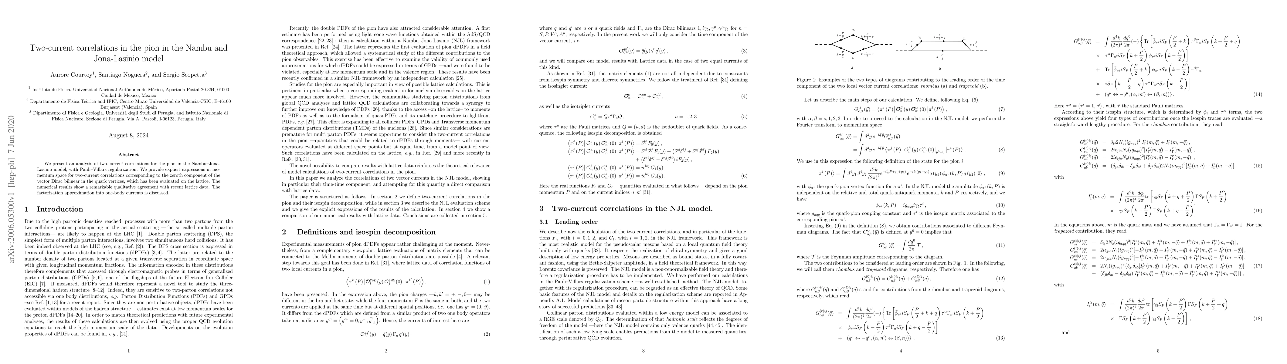 We present an analysis of two-current correlations for the pion in the Nambu--Jona-Lasinio model, with Pauli--Villars regularization. We provide explicit expressions in momentum space for two-current correlations corresponding to the zeroth component of the vector Dirac bilinear in the quark vertices, which has been evaluated on the lattice. The numerical results show a remarkable qualitative agreement with recent lattice data. The factorization approximation into one-body currents is discussed.