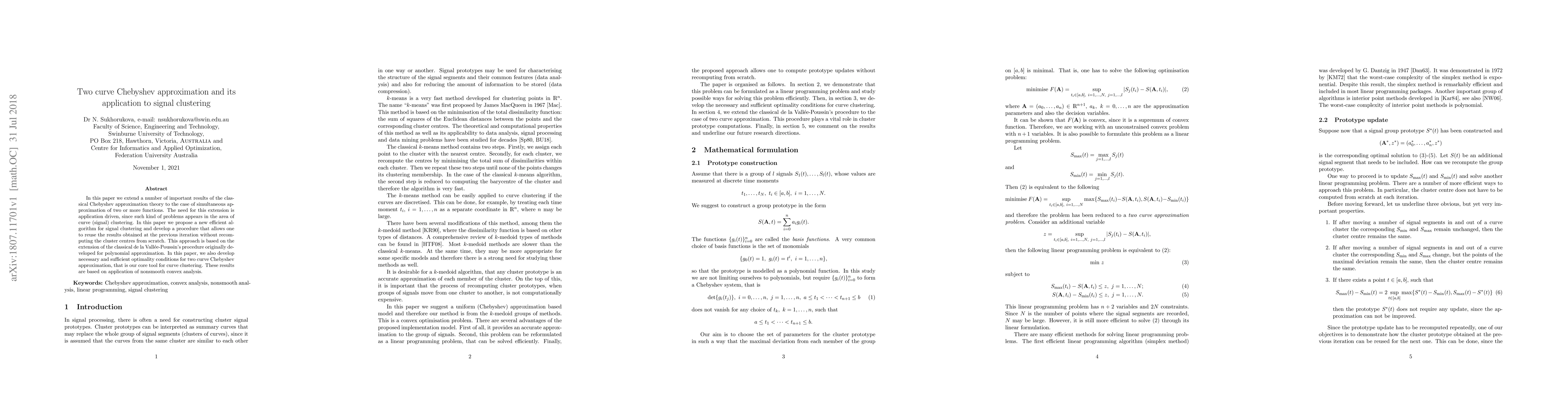 This paper develops a new efficient algorithm for signal clustering using two curve Chebyshev approximation, enabling reuse of results without re-computing cluster centers. It also establishes necessary and sufficient optimality conditions based on nonsmooth convex analysis.