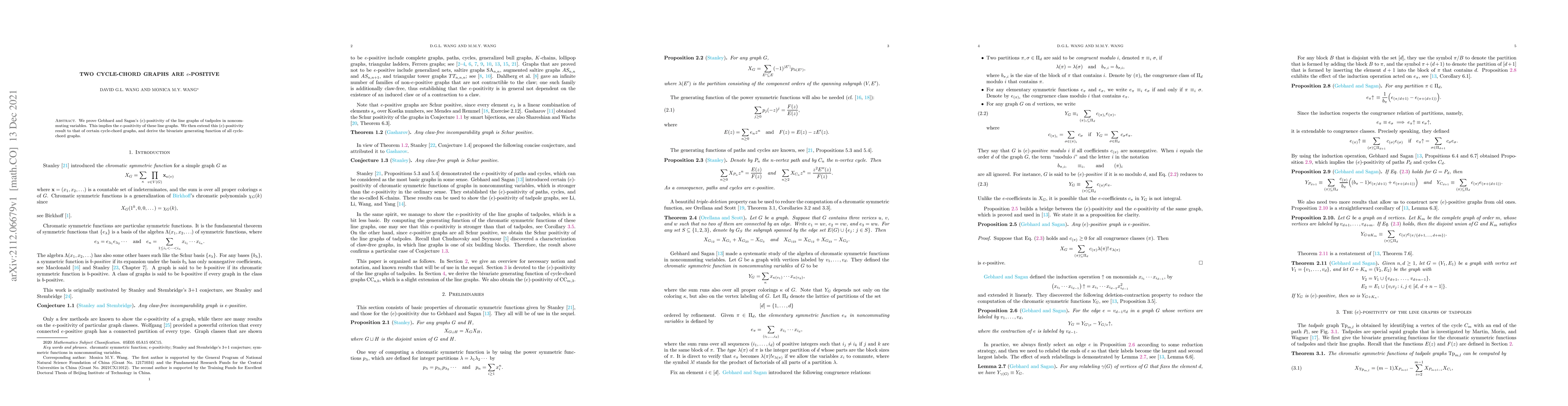 We prove Gebhard and Sagan's $(e)$-positivity of the line graphs of tadpoles in noncommuting variables. This implies the $e$-positivity of these line graphs. We then extend this $(e)$-positivity result to that of certain cycle-chord graphs, and derive the bivariate generating function of all cycle-chord graphs.