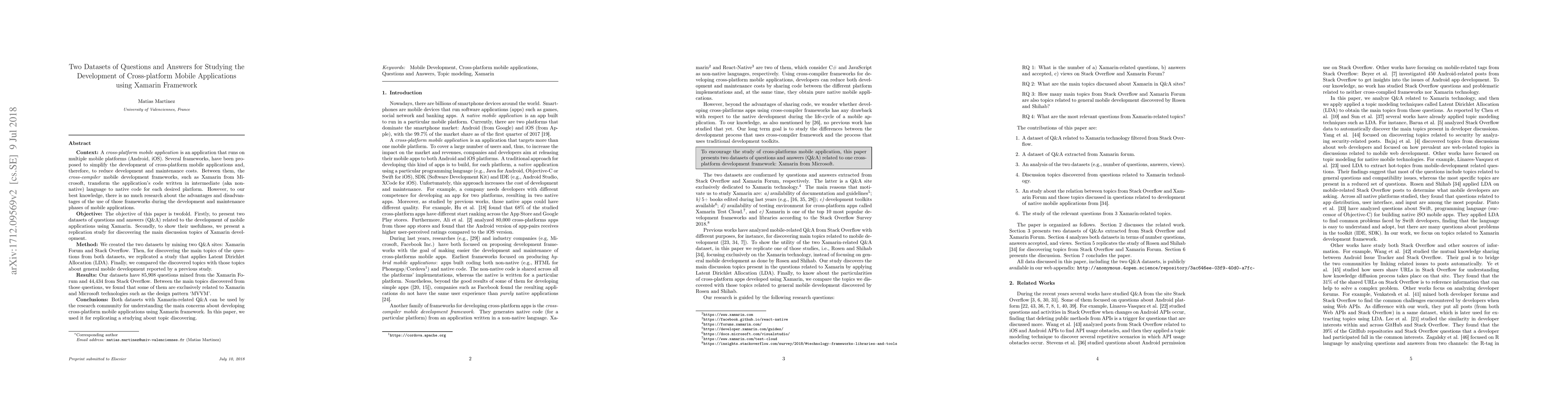 This paper presents two datasets of Xamarin-related questions and answers mined from Xamarin Forum and Stack Overflow, totaling 130,342 entries. The study replicates a topic discovery method to identify main discussion topics, revealing unique Xamarin-specific concerns like the "MVVM" design pattern.