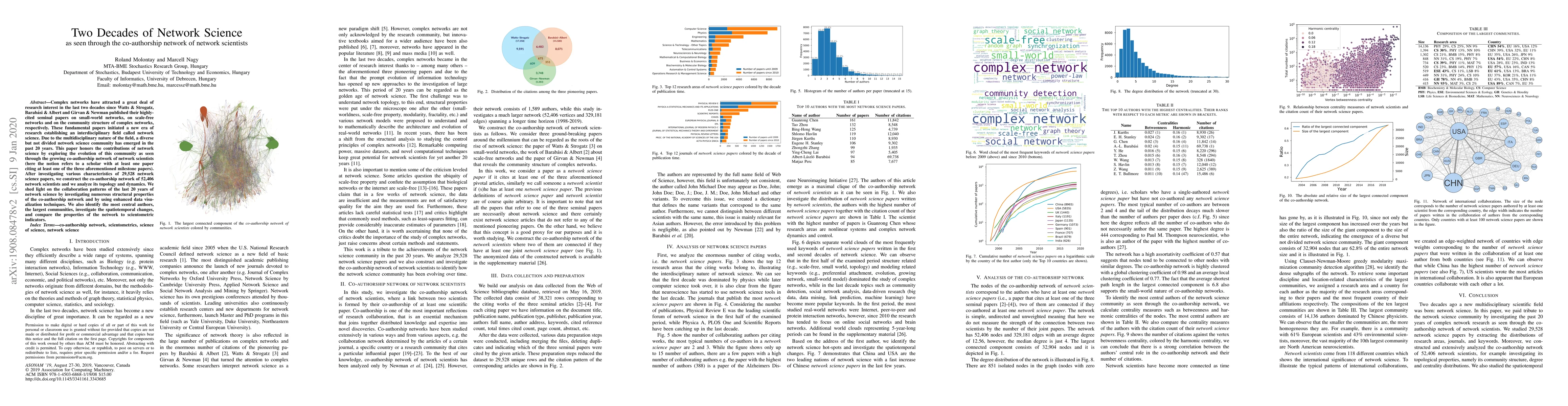Complex networks have attracted a great deal of research interest in the last two decades since Watts & Strogatz, Barab\'asi & Albert and Girvan & Newman published their highly-cited seminal papers on small-world networks, on scale-free networks and on the community structure of complex networks, respectively. These fundamental papers initiated a new era of research establishing an interdisciplinary field called network science. Due to the multidisciplinary nature of the field, a diverse but not divided network science community has emerged in the past 20 years. This paper honors the contributions of network science by exploring the evolution of this community as seen through the growing co-authorship network of network scientists (here the notion refers to a scholar with at least one paper citing at least one of the three aforementioned milestone papers). After investigating various characteristics of 29,528 network science papers, we construct the co-authorship network of 52,406 network scientists and we analyze its topology and dynamics. We shed light on the collaboration patterns of the last 20 years of network science by investigating numerous structural properties of the co-authorship network and by using enhanced data visualization techniques. We also identify the most central authors, the largest communities, investigate the spatiotemporal changes, and compare the properties of the network to scientometric indicators.