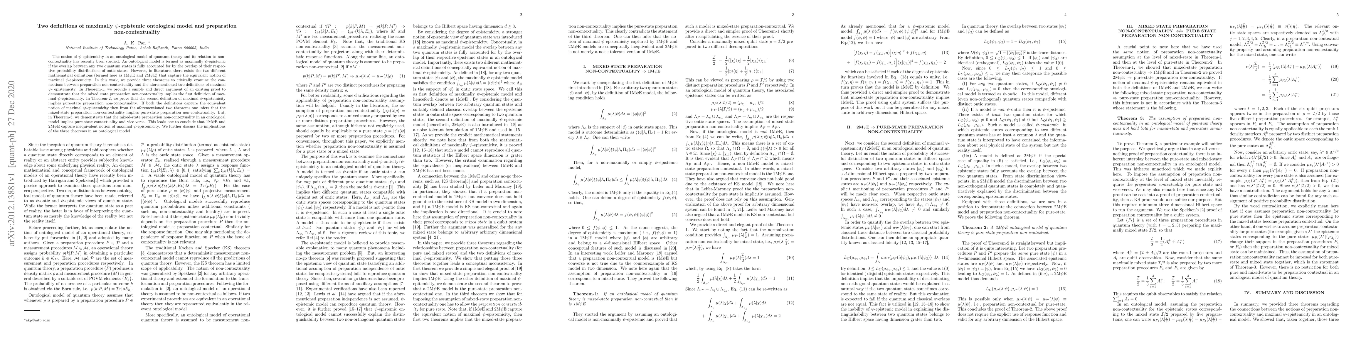 An ontological model is termed as maximally $\psi$-epistemic if the overlap between any two quantum states is fully accounted for by the overlap of their respective probability distributions of ontic states. However, in literature, there exists the two different mathematical definitions (termed here as 1M$\psi$E and 2M$\psi$E) that capture the equivalent notion of maximal $\psi$-epistemicity. In this work, we provide three theorems to critically examine the connections between preparation non-contextuality and the aforementioned two definitions of maximal $\psi$- epistemicity. In Theorem-1, we provide a simple and direct argument of an existing proof to demonstrate that the mixed state preparation non-contextuality implies the first definition of maximal $\psi$-epistemicity. In Theorem-2, we prove that the second definition of maximal $\psi$-epistemicity implies pure-state preparation non-contextuality. If both the definitions capture the equivalent notion of maximal $\psi$-epistemicity then from the aforementioned two theorems one infers that the mixed-state preparation non-contextuality implies pure-state preparation non-contextuality. But, in Theorem-3, we demonstrate that the mixed-state preparation non-contextuality in an ontological model implies pure-state contextuality and vice-versa. This leads one to conclude that 1M$\psi$E and 2M$\psi$E capture inequivalent notion of maximal $\psi$-epistemicity. The implications of our results and their connections to other no-go theorems are discussed.