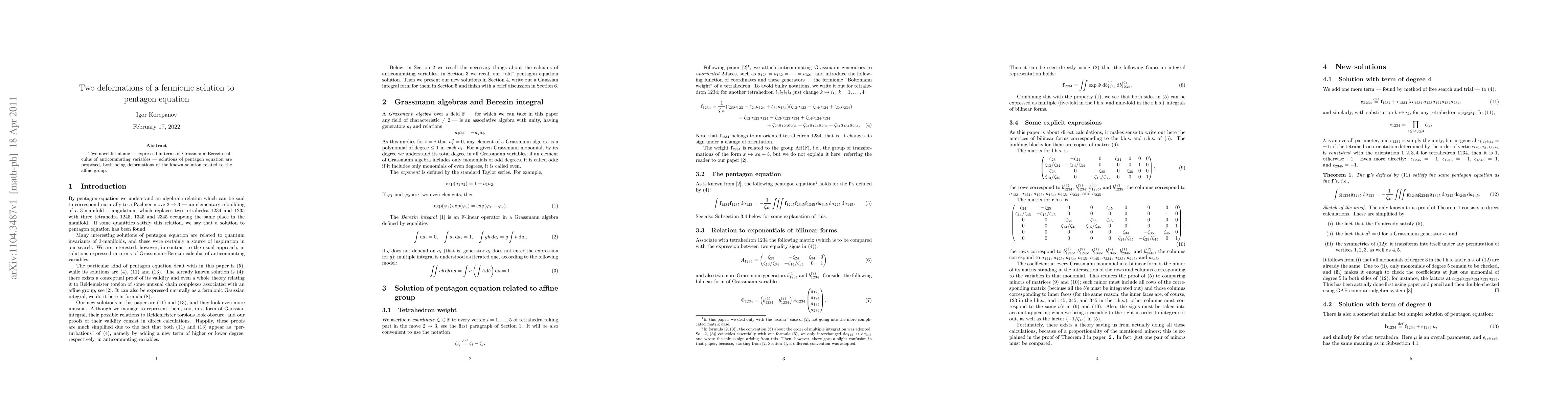 Two new fermionic solutions to the pentagon equation are proposed as deformations of a known affine group solution, expanding our understanding of this mathematical problem.