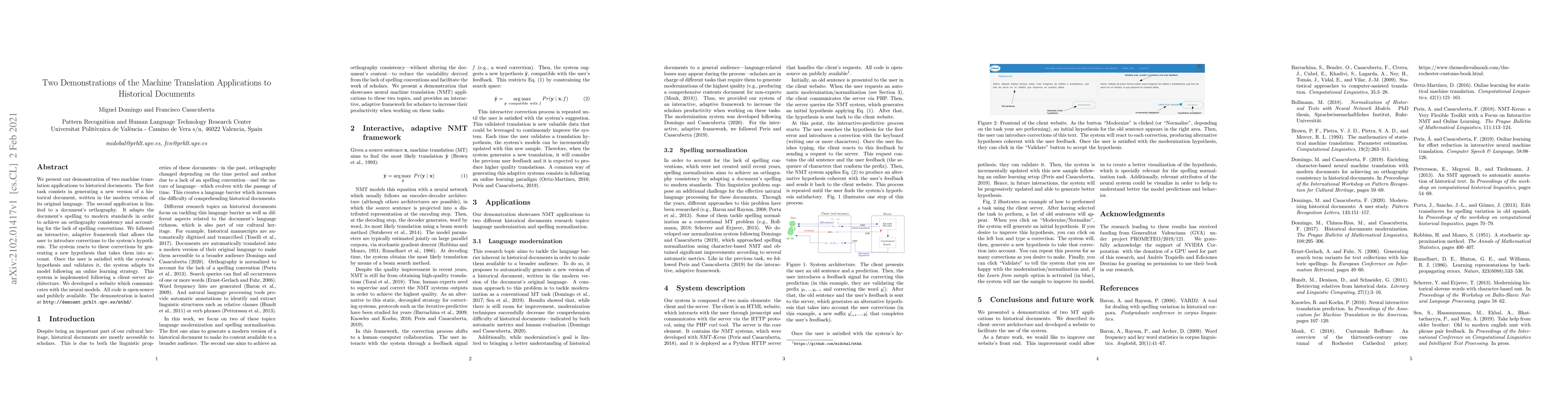 We present our demonstration of two machine translation applications to historical documents. The first task consists in generating a new version of a historical document, written in the modern version of its original language. The second application is limited to a document's orthography. It adapts the document's spelling to modern standards in order to achieve an orthography consistency and accounting for the lack of spelling conventions. We followed an interactive, adaptive framework that allows the user to introduce corrections to the system's hypothesis. The system reacts to these corrections by generating a new hypothesis that takes them into account. Once the user is satisfied with the system's hypothesis and validates it, the system adapts its model following an online learning strategy. This system is implemented following a client-server architecture. We developed a website which communicates with the neural models. All code is open-source and publicly available. The demonstration is hosted at http://demosmt.prhlt.upv.es/mthd/.