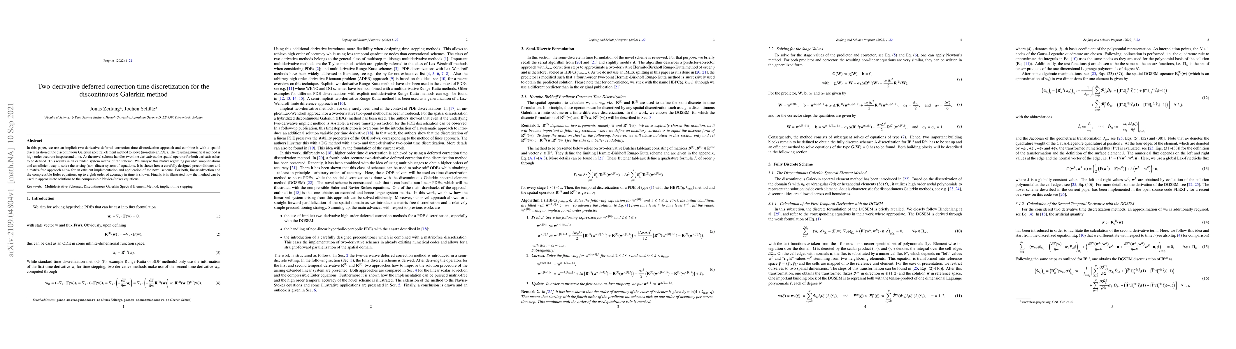 In this paper, we use an implicit two-derivative deferred correction time discretization approach and combine it with a spatial discretization of the discontinuous Galerkin spectral element method to solve (non-)linear PDEs. The resulting numerical method is high order accurate in space and time. As the novel scheme handles two time derivatives, the spatial operator for both derivatives has to be defined. This results in an extended system matrix of the scheme. We analyze this matrix regarding possible simplifications and an efficient way to solve the arising (non-)linear system of equations. It is shown how a carefully designed preconditioner and a matrix-free approach allow for an efficient implementation and application of the novel scheme. For both, linear advection and the compressible Euler equations, up to eighth order of accuracy in time is shown. Finally, it is illustrated how the method can be used to approximate solutions to the compressible Navier-Stokes equations.