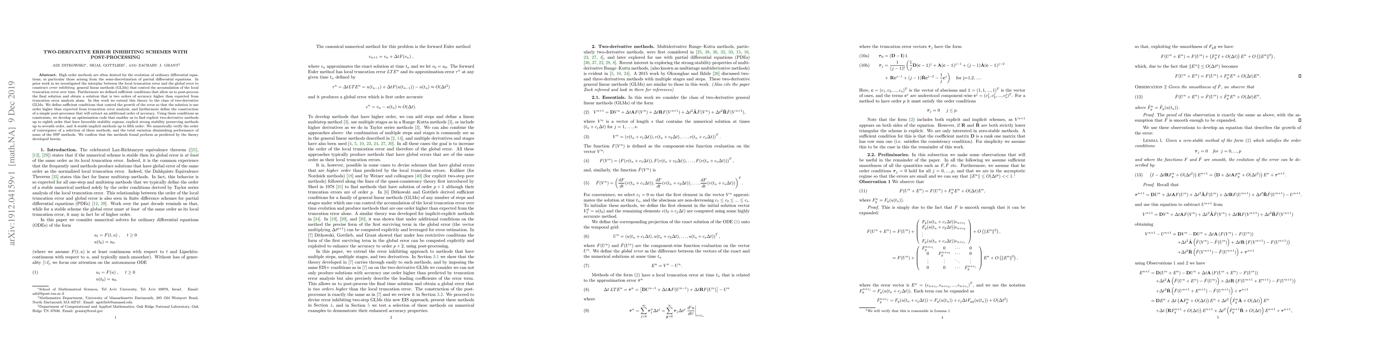 High order methods are often desired for the evolution of ordinary differential equations, in particular those arising from the semi-discretization of partial differential equations. In prior work in we investigated the interplay between the local truncation error and the global error to construct error inhibiting general linear methods (GLMs) that control the accumulation of the local truncation error over time. Furthermore we defined sufficient conditions that allow us to post-process the final solution and obtain a solution that is two orders of accuracy higher than expected from truncation error analysis alone. In this work we extend this theory to the class of two-derivative GLMs. We define sufficient conditions that control the growth of the error so that the solution is one order higher than expected from truncation error analysis, and furthermore define the construction of a simple post-processor that will extract an additional order of accuracy. Using these conditions as constraints, we develop an optimization code that enables us to find explicit two-derivative methods up to eighth order that have favorable stability regions, explicit strong stability preserving methods up to seventh order, and A-stable implicit methods up to fifth order. We numerically verify the order of convergence of a selection of these methods, and the total variation diminishing performance of some of the SSP methods. We confirm that the methods found perform as predicted by the theory developed herein.