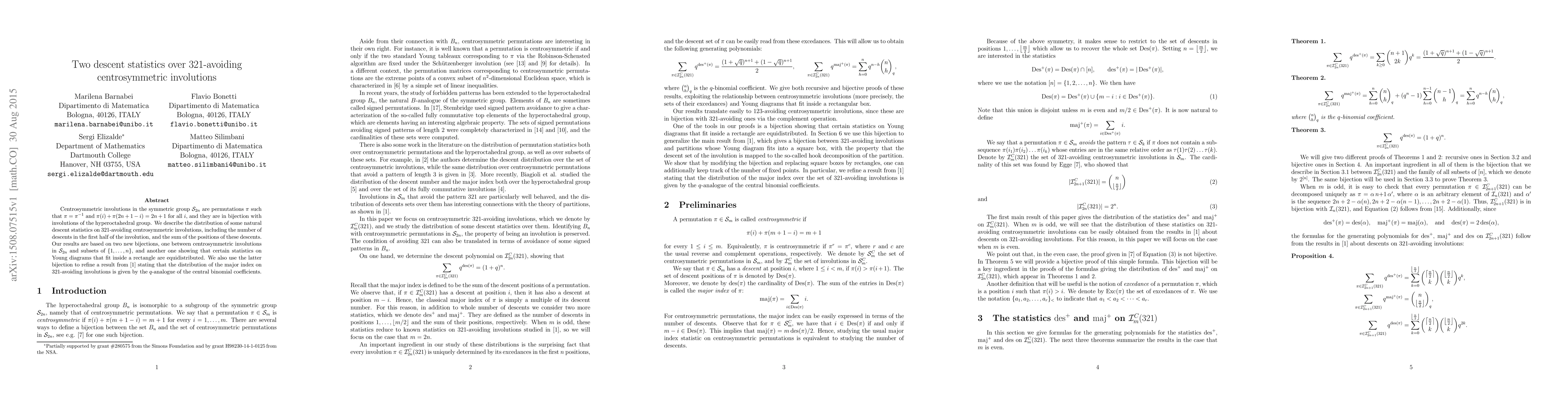 This paper explores descent statistics in 321-avoiding centrosymmetric involutions, providing new bijections and proving their equidistribution. It refines the distribution of the major index using a q-analogue of central binomial coefficients.