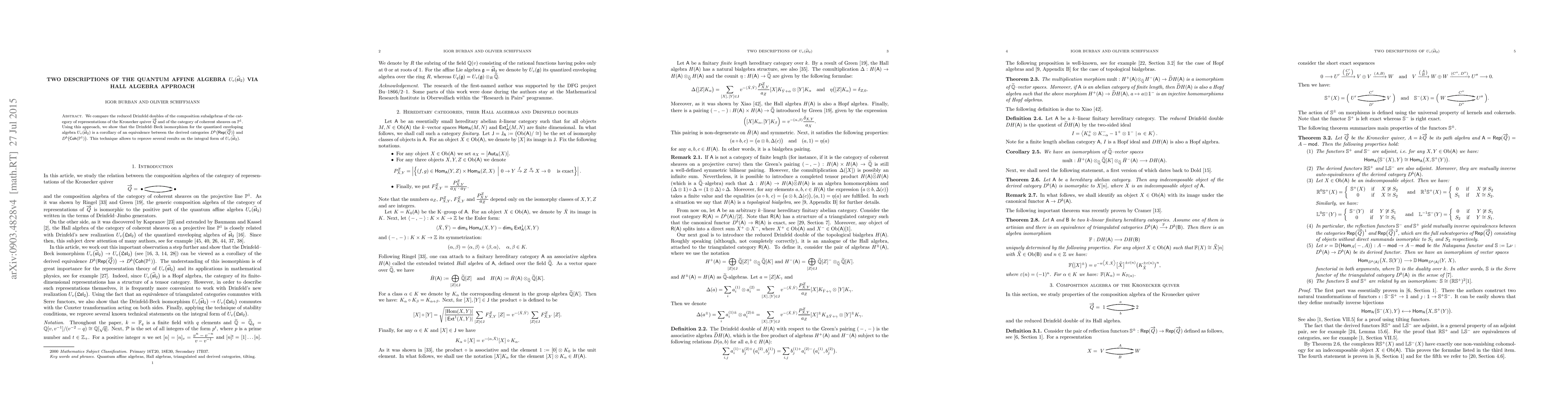 We compare the reduced Drinfeld doubles of the composition subalgebras of the category of representations of the Kronecker quiver $\overr{Q}$ and of the category of coherent sheaves on ${\mathbb P}^1$. Using this approach, we show that the Drinfeld--Beck isomorphism for the quantized enveloping algebra $U_v(\hat{\mathfrak{sl}}_2)$ is a corollary of an equivalence between the derived categories $D^b\bigl(\Rep(\overr{Q})\bigr)$ and $D^b\bigl(\Coh({\mathbb P}^1)\bigr)$. This technique also allows to reprove several technical results on the integral form of $U_v(\hat{\mathfrak{sl}}_2)$.