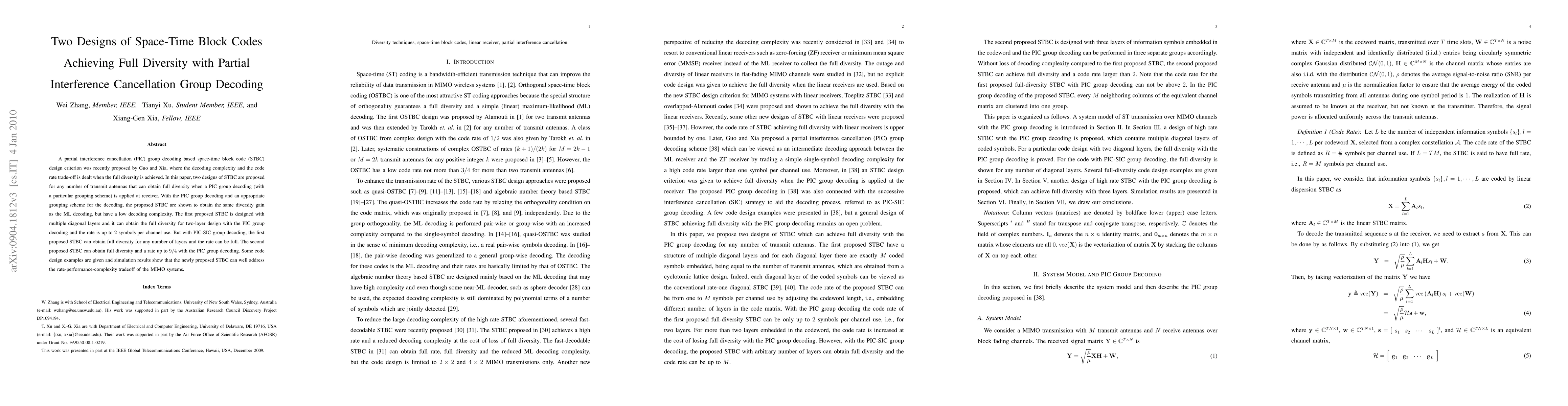 Researchers propose two space-time block codes that achieve full diversity with partial interference cancellation group decoding, balancing rate and complexity in MIMO systems.