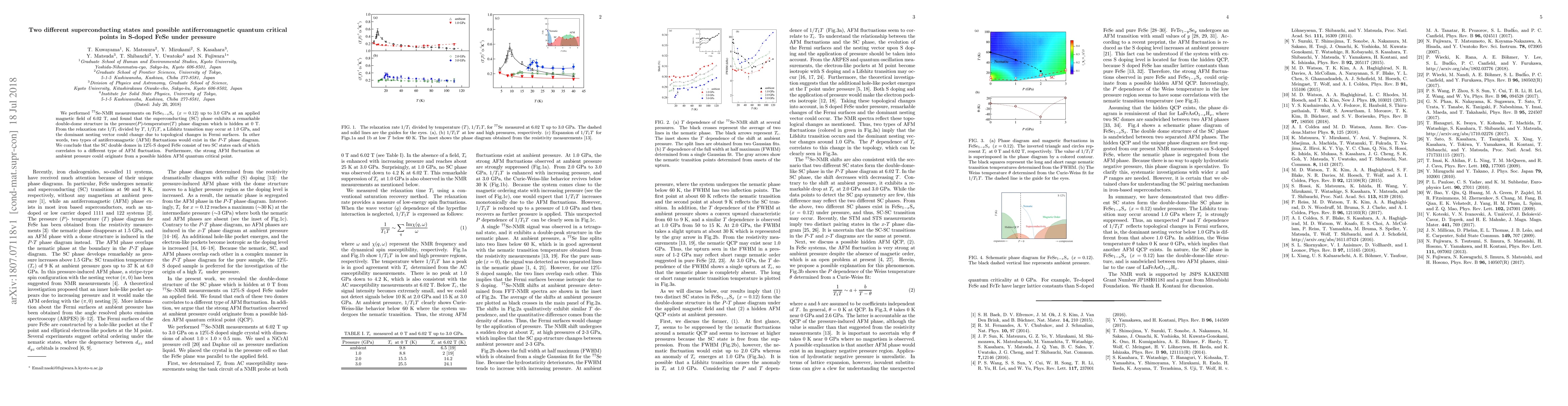 We performed $^{77}$Se-NMR measurements on FeSe$_{1-x}$S$_x$, ($x$ = 0.12) up to 3.0 GPa at an applied magnetic field of 6.02 T, and found that the superconducting (SC) phase exhibits a remarkable double-dome structure in the pressure($P$)-temperature($T$) phase diagram which is hidden at 0 T. From the relaxation rate $1/T_1$ divided by $T$, $1/T_1T$, a Lifshitz transition may occur at 1.0 GPa, and the dominant nesting vector could change due to topological changes in Fermi surfaces. In other words, two types of antiferromagnetic (AFM) fluctuations would exist in the $P-T$ phase diagram. We conclude that the SC double domes in 12%-S doped FeSe consist of two SC states each of which correlates to a different type of AFM fluctuation. Furthermore, the strong AFM fluctuation at ambient pressure could originate from a possible hidden AFM quantum critical point.