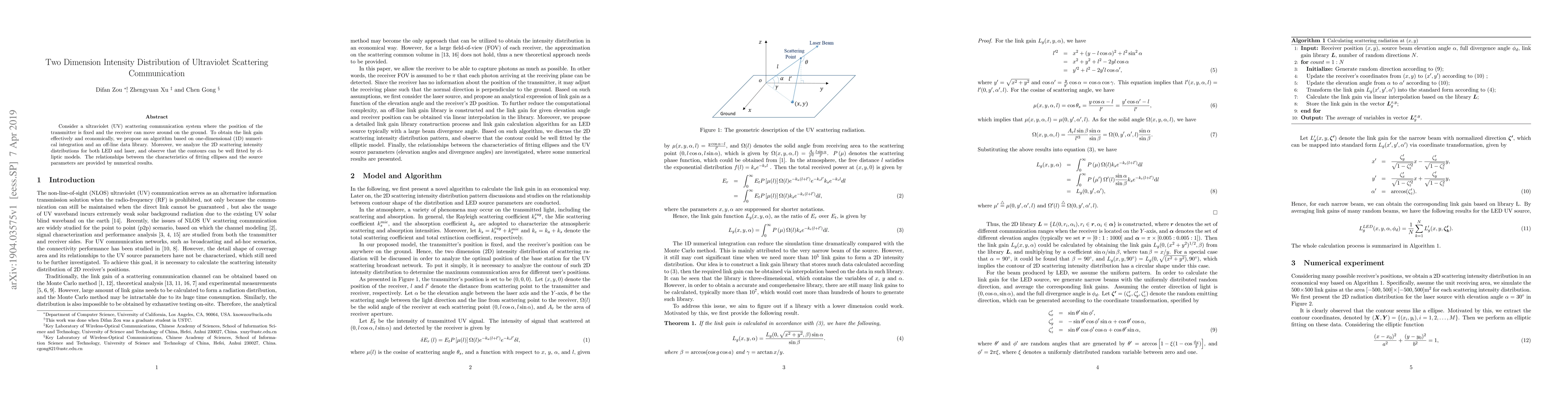 This paper proposes an algorithm for optimizing the link gain in a UV scattering communication system using 1D numerical integration and an off-line data library. It analyzes the two-dimensional intensity distributions of UV scattering from both LED and laser sources, finding that the contours can be modeled by elliptical fits, with relationships between ellipse characteristics and source parameters established through numerical results.