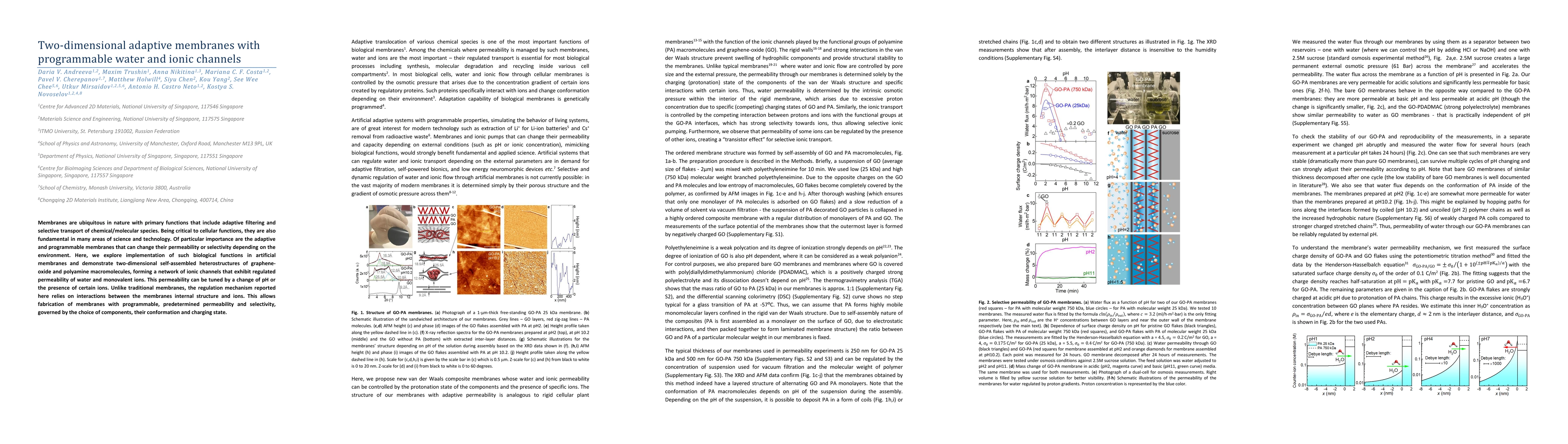 This paper presents adaptive, programmable two-dimensional membranes composed of graphene oxide and polyamine macromolecules, capable of regulating water and ionic permeability based on pH changes or ion presence. The unique regulation mechanism relies on specific interactions between membrane components and ions, enabling predetermined permeability and selectivity.