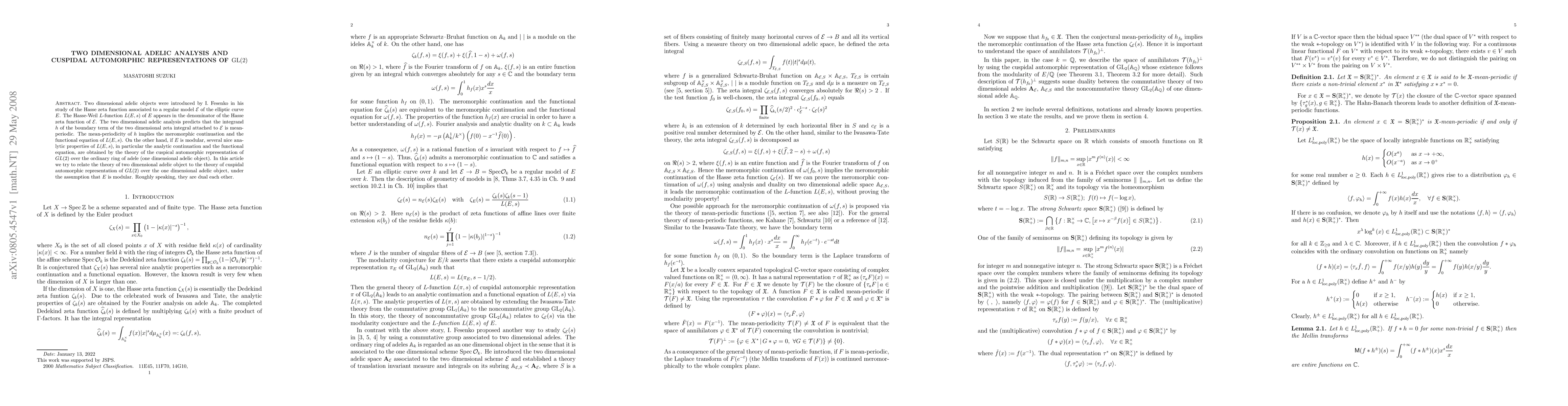 Two dimensional adelic objects were introduced by I. Fesenko in his study of the Hasse zeta function associated to a regular model $\mathcal E$ of the elliptic curve $E$. The Hasse-Weil $L$-function $L(E,s)$ of $E$ appears in the denominator of the Hasse zeta function of $\mathcal E$. The two dimensional adelic analysis predicts that the integrand $h$ of the boundary term of the two dimensional zeta integral attached to $\mathcal E$ is mean-periodic. The mean-periodicity of $h$ implies the meromorphic continuation and the functional equation of $L(E,s)$. On the other hand, if $E$ is modular, several nice analytic properties of $L(E,s)$, in particular the analytic continuation and the functional equation, are obtained by the theory of the cuspical automorphic representation of GL(2) over the ordinary ring of adele (one dimensional adelic object). In this article we try to relate the theory of two dimensional adelic object to the theory of cuspidal automorphic representation of GL(2) over the one dimensional adelic object, under the assumption that $E$ is modular. Roughly speaking, they are dual each other.