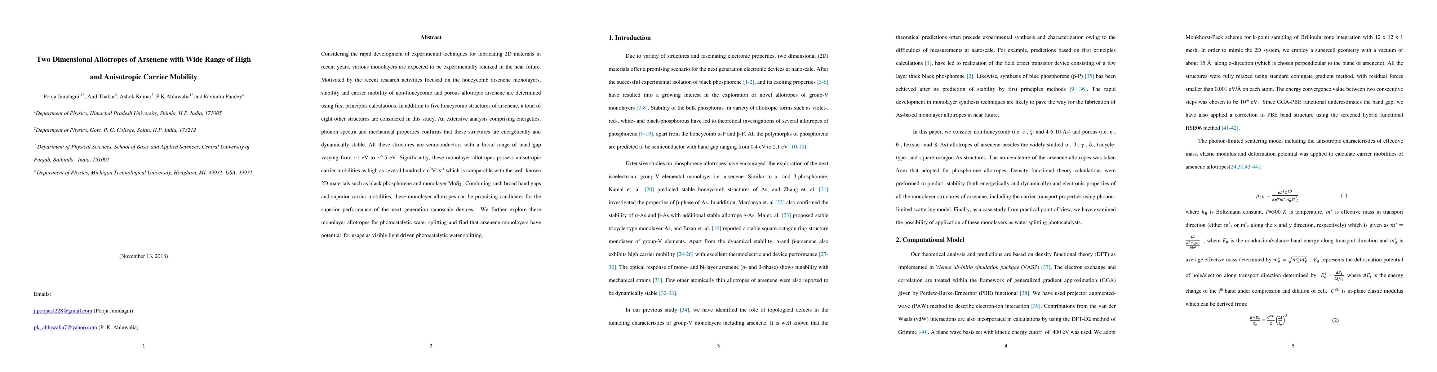 This paper investigates various two-dimensional allotropes of arsenene beyond the honeycomb structure, finding them to be energetically and dynamically stable semiconductors with band gaps ranging from 1 to 2.5 eV. These allotropes exhibit anisotropic carrier mobilities comparable to black phosphorene and monolayer MoS₂, suggesting potential for advanced nanoscale devices and visible light-driven photocatalytic water splitting.