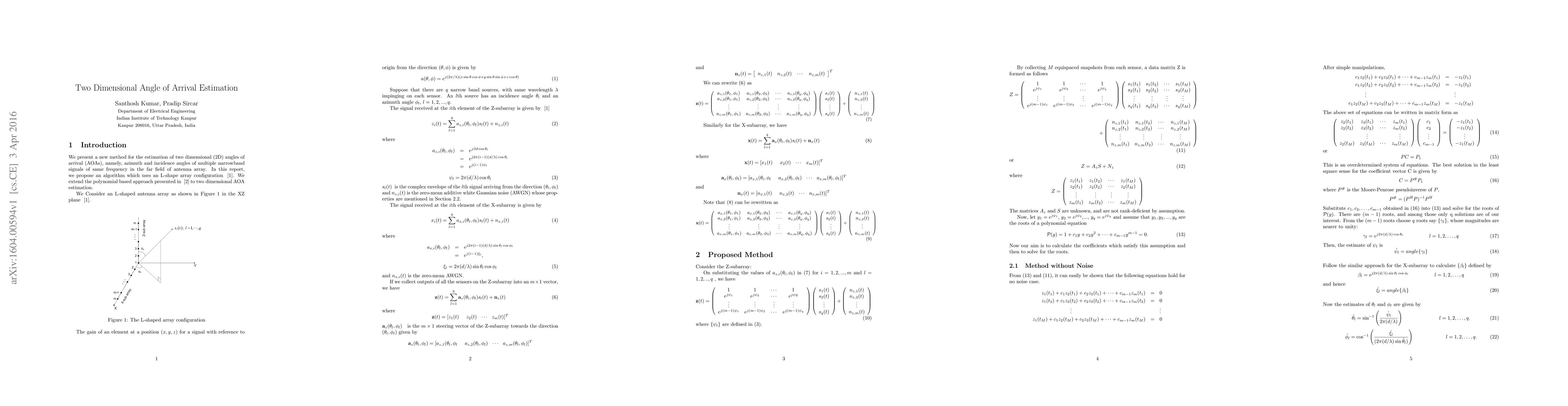 We present a new method for the estimation of two dimensional (2D) angles of arrival (AOAs), namely, azimuth and incidence angles of multiple narrowband signals of same frequency in the far field of antenna array.