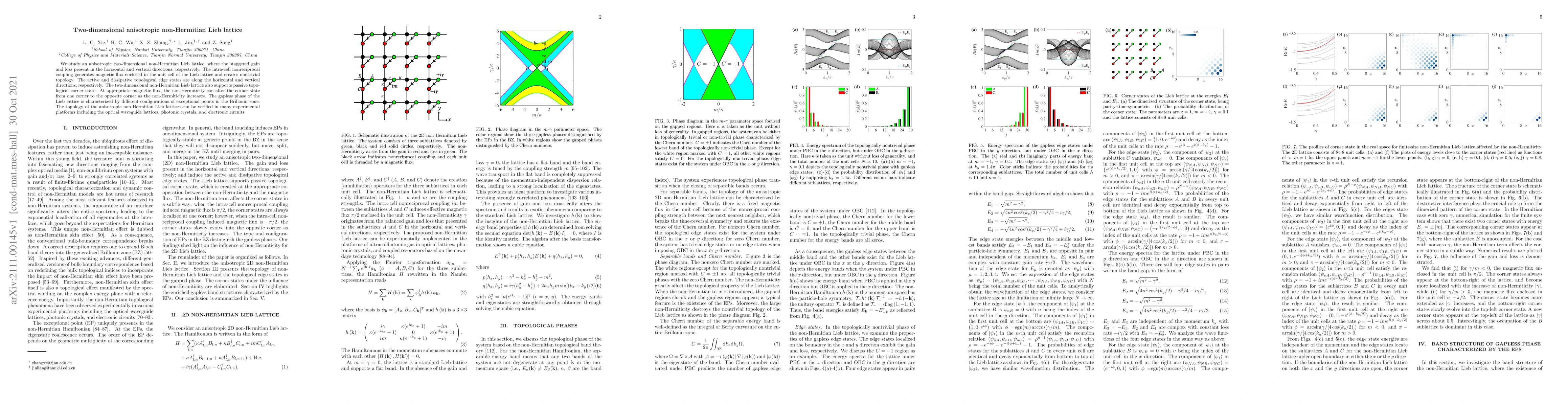 We study an anisotropic two-dimensional non-Hermitian Lieb lattice, where the staggered gain and loss present in the horizontal and vertical directions, respectively. The intra-cell nonreciprocal coupling generates magnetic flux enclosed in the unit cell of the Lieb lattice and creates nontrivial topology. The active and dissipative topological edge states are along the horizontal and vertical directions, respectively. The two-dimensional non-Hermitian Lieb lattice also supports passive topological corner state. At appropriate magnetic flux, the non-Hermiticity can alter the corner state from one corner to the opposite corner as the non-Hermiticity increases. The gapless phase of the Lieb lattice is characterized by different configurations of exceptional points in the Brillouin zone. The topology of the anisotropic non-Hermitian Lieb lattices can be verified in many experimental platforms including the optical waveguide lattices, photonic crystals, and electronic circuits.