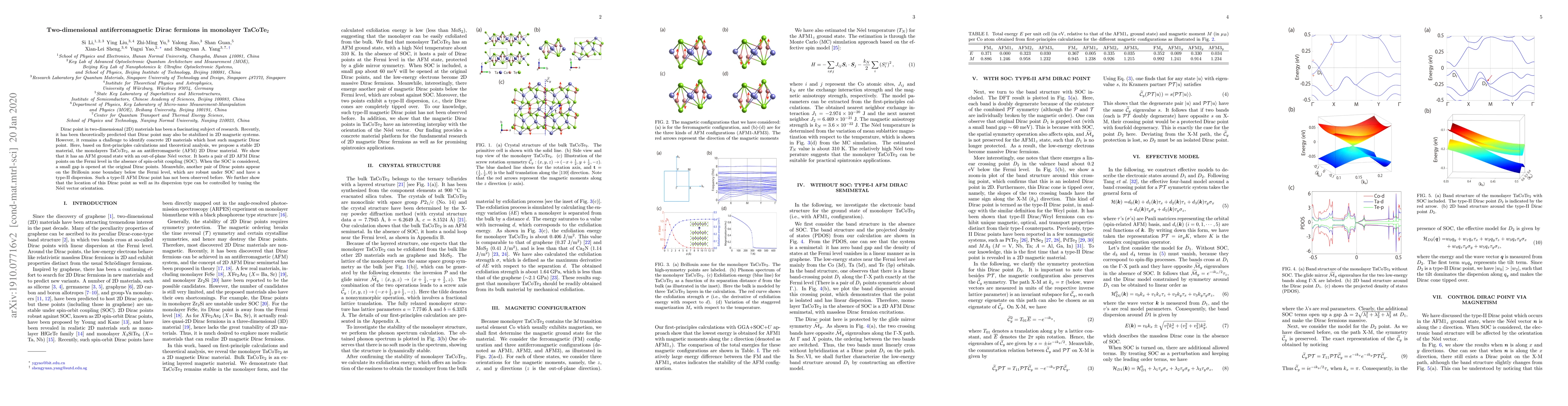 This paper proposes monolayer TaCoTe$_2$ as a stable two-dimensional antiferromagnetic Dirac material with unique type-II AFM Dirac points. The material exhibits a stable AFM ground state and novel Dirac points that open a small gap under spin-orbit coupling, with their properties tunable by adjusting the Néel vector orientation.