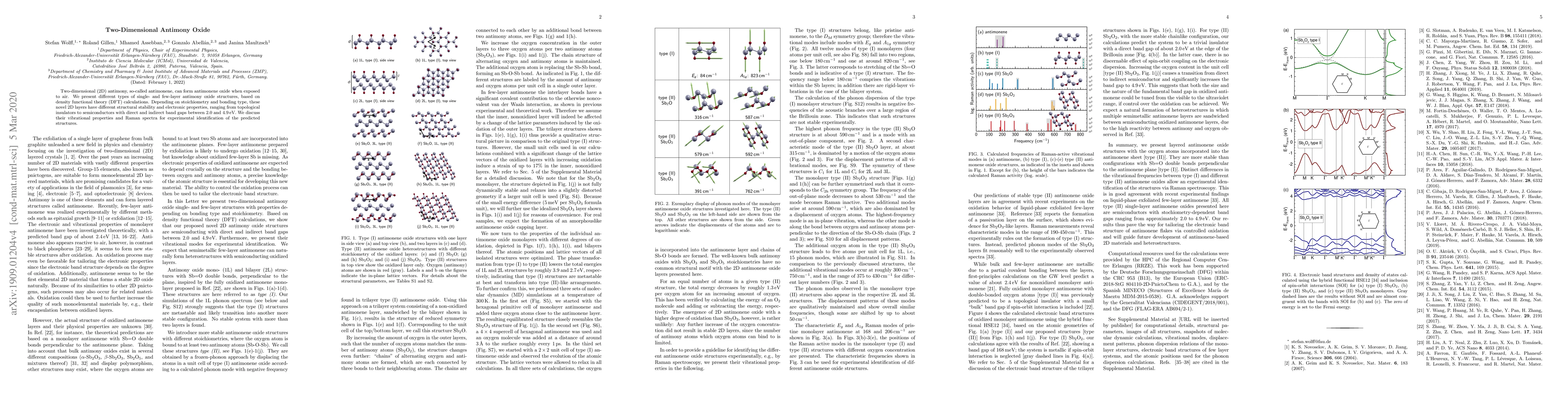 Two-dimensional (2D) antimony, so-called antimonene, can form antimonene oxide when exposed to air. We present different types of single- and few-layer antimony oxide structures, based on density functional theory (DFT) calculations. Depending on stoichiometry and bonding type, these novel 2D layers have different structural stability and electronic properties, ranging from topological insulators to semiconductors with direct and indirect band gaps between 2.0 and 4.9 eV. We discuss their vibrational properties and Raman spectra for experimental identification of the predicted structures.