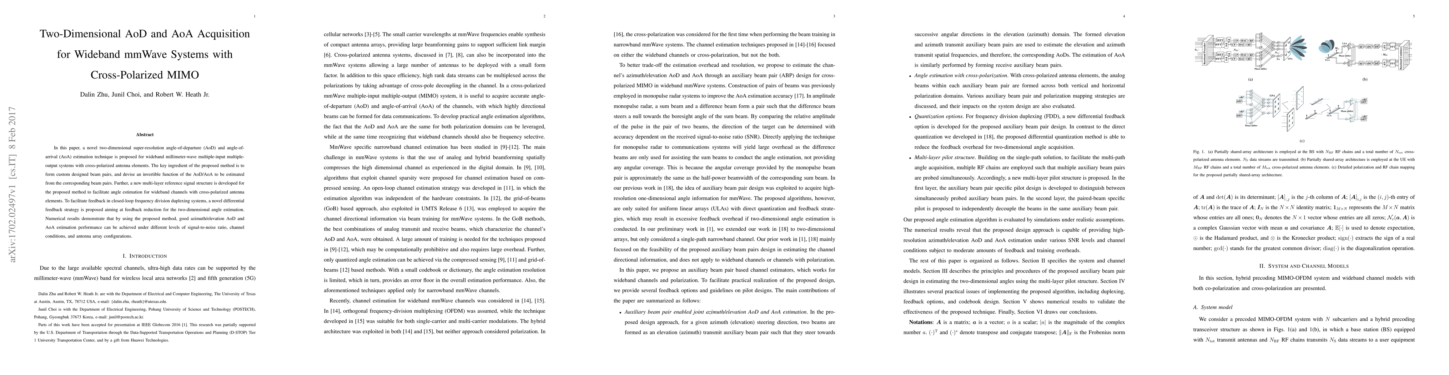 This paper proposes a novel two-dimensional super-resolution technique for estimating AoD and AoA in wideband mmWave MIMO systems with cross-polarized antennas, utilizing custom beam pairs and a new multi-layer reference signal structure. A differential feedback strategy is also introduced to reduce feedback overhead, achieving accurate angle estimation across various conditions.