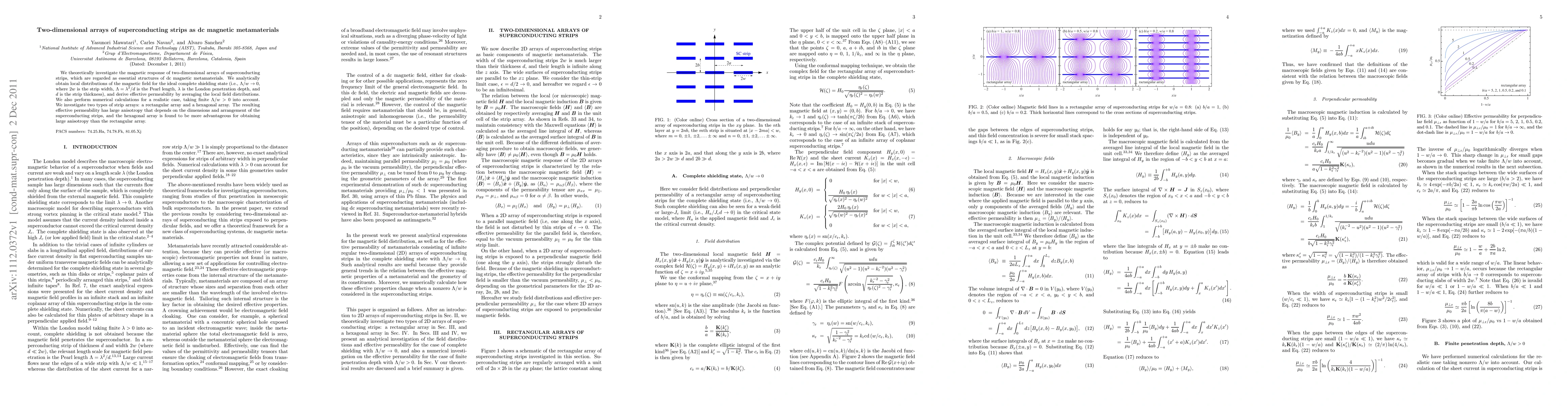 This paper theoretically investigates the magnetic response of two-dimensional arrays of superconducting strips, deriving effective permeability and analyzing local magnetic field distributions. It finds that hexagonal arrays exhibit greater anisotropy than rectangular arrays, making them more advantageous for dc magnetic metamaterials.