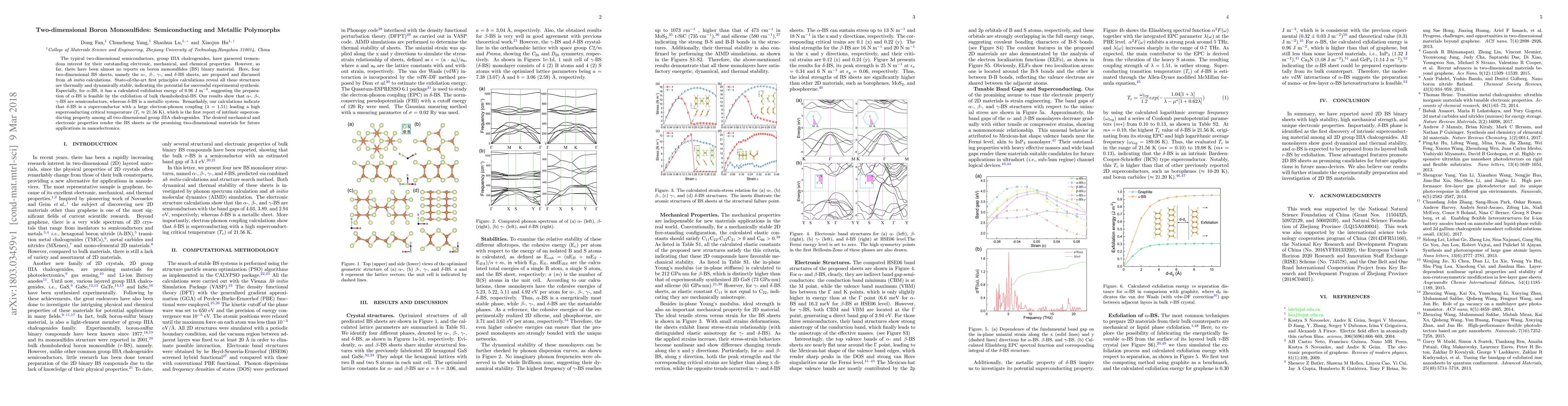 The typical two-dimensional semiconductors, group \uppercase\expandafter{\romannumeral3A} chalcogenides, have garnered tremendous interest for their outstanding electronic, mechanical, and chemical properties. However, so far, there have been almost no reports on boron monosulfides (BS) binary material. Here, four two-dimensional BS sheets, namely the $\alpha$-, $\beta$-, $\gamma$-, and $\delta$-BS sheets, are proposed and discussed from $\emph{ab initio}$ calculations. State-of-the-art first-principles calculations reveal all these structures are thermally and dynamically stable, indicating the potential for successful experimental synthesis. Especially, for $\alpha$-BS, it has a calculated exfoliation energy of 0.96 J m$^{-2}$, suggesting the preparation of $\alpha$-BS is feasible by the exfoliation of bulk rhombohedral-BS. Our results show that $\alpha$-, $\beta$-, $\gamma$-BS are semiconductors, whereas $\delta$-BS is a metallic system. Remarkably, our calculations indicate that $\delta$-BS is a superconductor with a large electron-phonon coupling ($\lambda$ = 1.51) leading a high superconducting critical temperature ($T_c$ $\approx $ 21.56 K), which is the first report of intrinsic superconducting property among all two-dimensional group \uppercase\expandafter{\romannumeral3A} chalcogenides. The desired mechanical and electronic properties render the BS sheets as the promising two-dimensional materials for future applications in nanoelectronics.