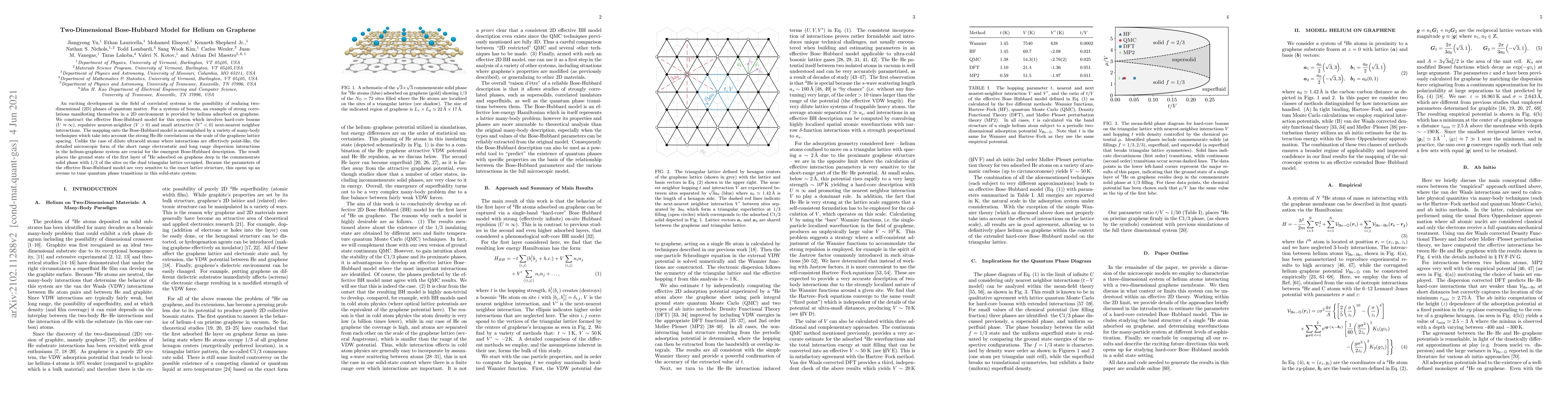 This paper constructs an effective Bose-Hubbard model for helium on graphene, revealing strong correlations in a two-dimensional bosonic system. The model captures detailed microscopic interactions, predicting a commensurate solid phase with significant occupation on the dual triangular lattice, and suggests tunable quantum phase transitions.