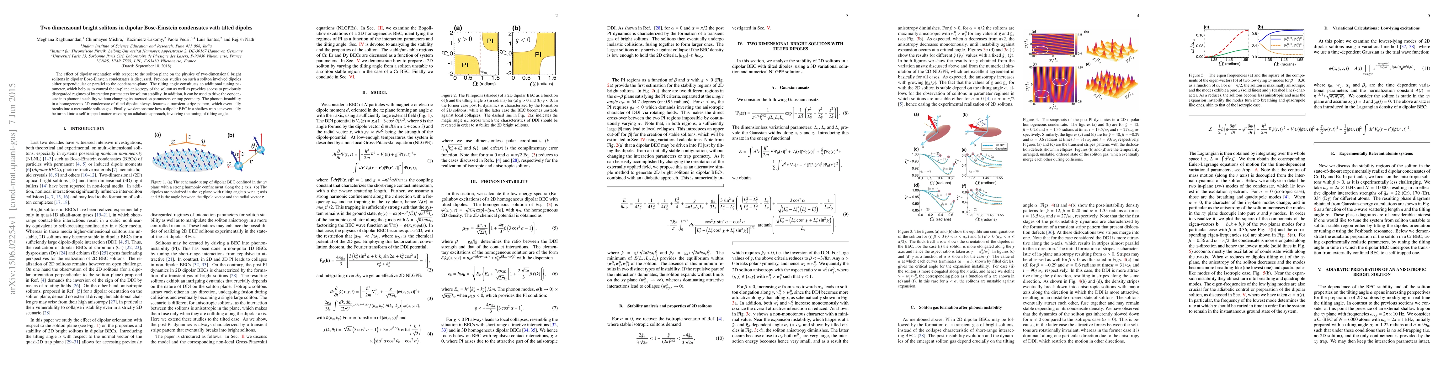 This paper investigates two-dimensional bright solitons in dipolar Bose-Einstein condensates (BECs) with tilted dipoles, exploring how the dipolar orientation affects soliton properties and stability. It reveals that adjusting the tilting angle can control soliton anisotropy and drive phonon instability, leading to a transient stripe pattern that forms a metastable soliton gas.