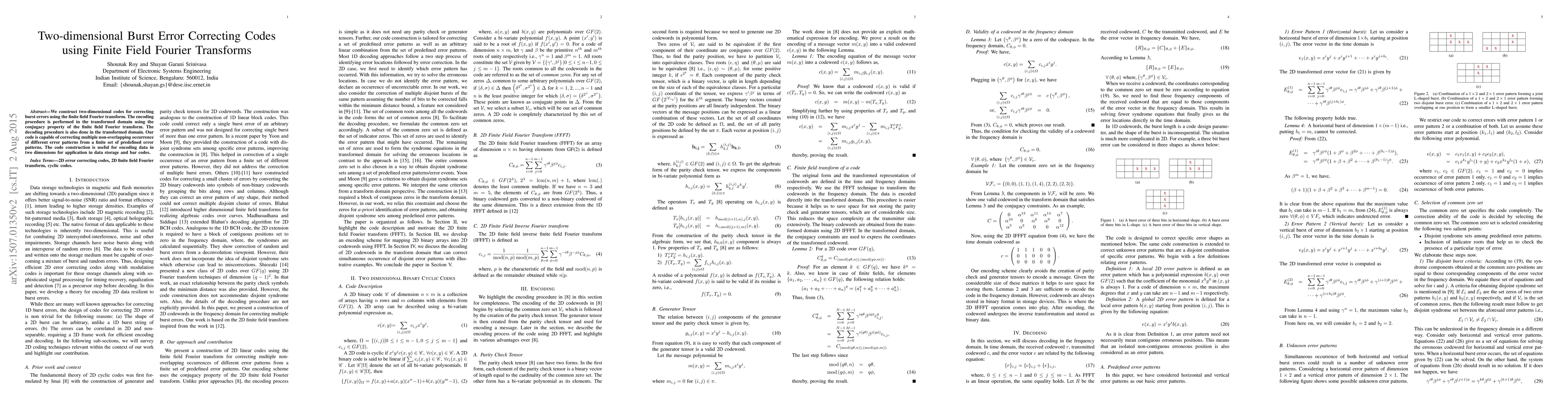 This paper proposes a two-dimensional burst error correcting code utilizing finite field Fourier transforms, enabling efficient encoding and decoding in the transformed domain. The method corrects multiple non-overlapping error patterns from a predefined set, enhancing data storage and bar code applications.