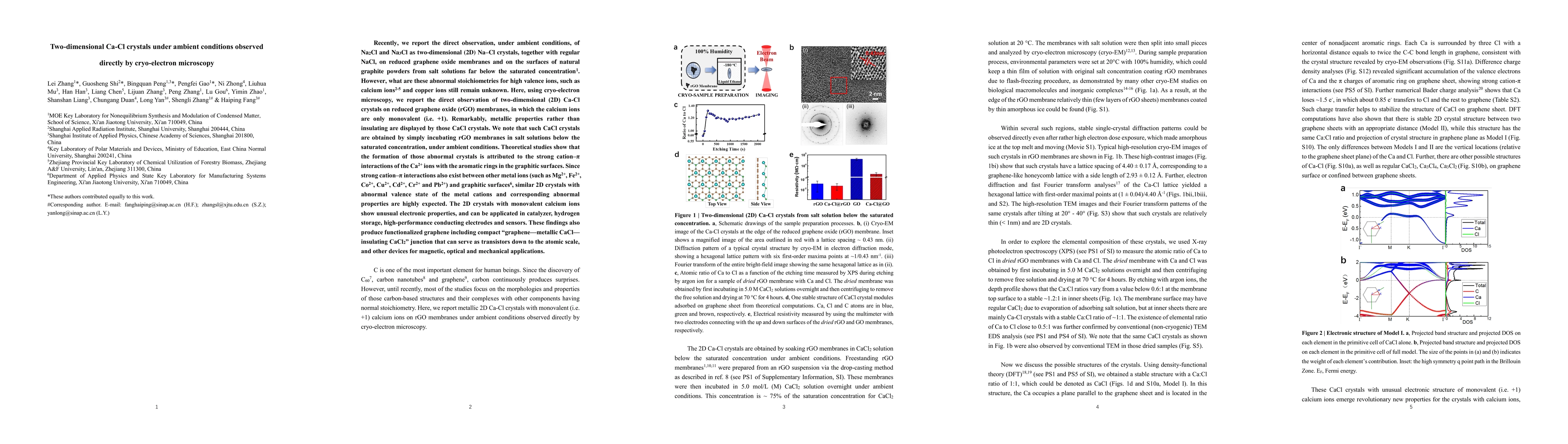 This study reports the direct observation of two-dimensional Ca-Cl crystals with monovalent calcium ions on reduced graphene oxide via cryo-electron microscopy, revealing metallic properties instead of insulating behavior. The formation is attributed to strong cation-pi interactions between Ca2+ ions and graphitic surfaces.